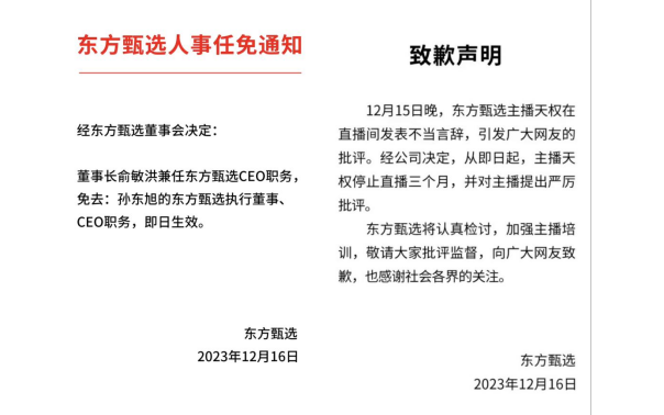 12月16日午间,东方甄选的一纸公告让传闻中的“二选一”照进现实:董事长俞敏洪兼任东方甄选CEO职务,免去孙东旭的东方甄选执行董事、CEO职务,即日生效。
