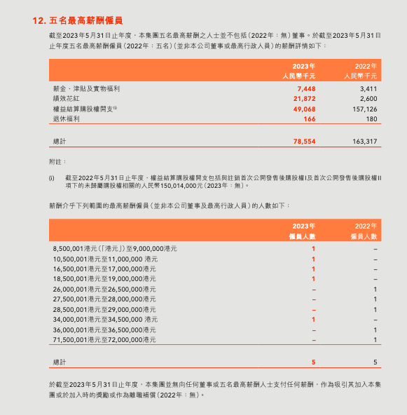 这五名高薪酬员工的收入区间分别是850万-900万港元、1050万-1100万港元、1650万-1700万港元、1850万-1900万港元、3400万-3450万港元。