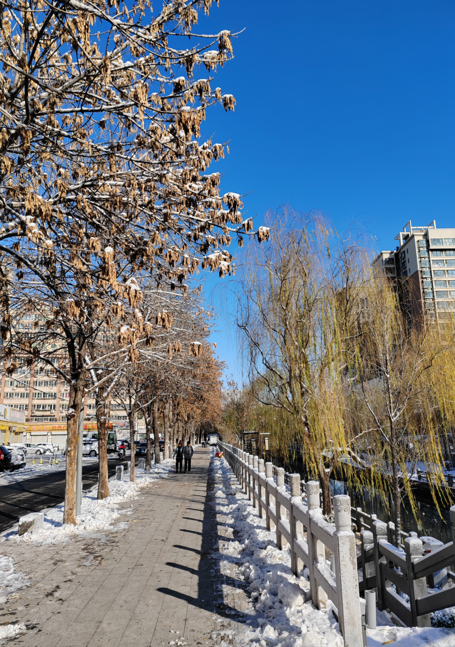 一夜风雪过后,美丽的东工商河边更加迷人,昔日苍翠的柳树宛若披上了一层白色纱衣,两旁的花草被堆积的雪花包裹着、埋藏着,不见了踪影。俗话说“下雪不冷化雪冷”,虽已是晴天,但是天气依然寒冷无比,往日络绎不绝的游人现在却寥寥无几,清澈见底的河水不再奔流不息,也没有了鱼儿活跃的身影,只剩下那些不怕冷的孩子在雪中嬉闹,还有零散在路旁遛狗的老人家。