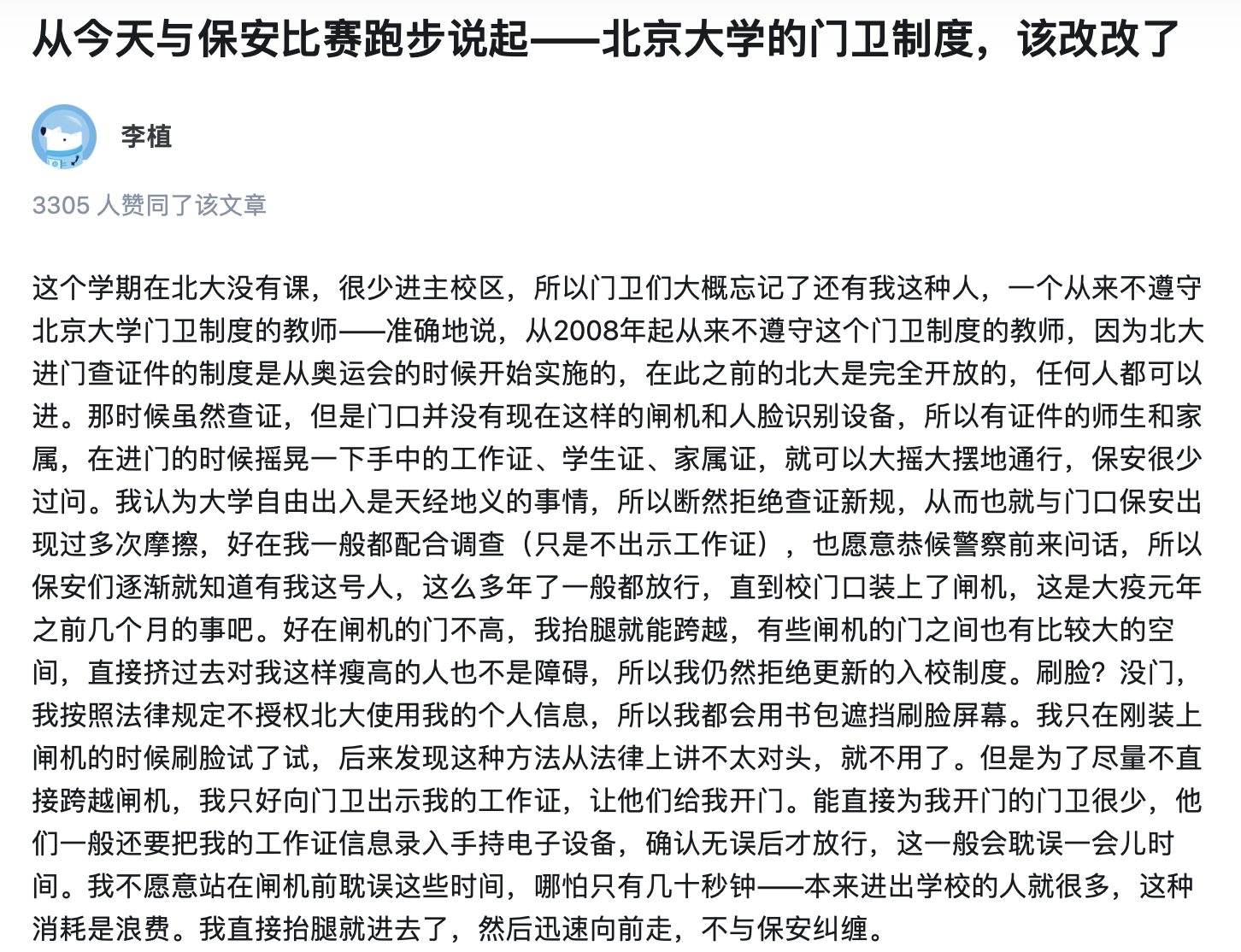 李植在一篇名为《从今天与保安比赛跑步说起——北京大学的门卫制度,该改改了》的网文里写道,大学自由出入是天经地义的事情。作者将自己形容是“一个从来不遵守北京大学门卫制度的教师”,描写的经历细节看起来颇有喜剧效果,引来众多高校师生和网友的跟评,李植这种“狼狈”的经历和“反叛”的态度,激发了不少共鸣。