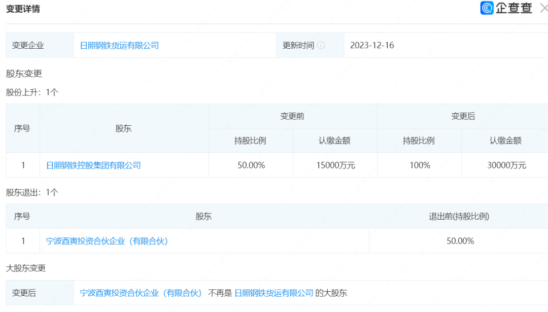 此前,日照钢铁货运有限公司有两名股东:宁波酉寅投资合伙企业(有限合伙)和日照钢铁,二者分别持股50%。此番变更后,宁波酉寅投资合伙企业(有限合伙)不再是日照钢铁货运有限公司的大股东,日照钢铁的持股比例上升至100%。