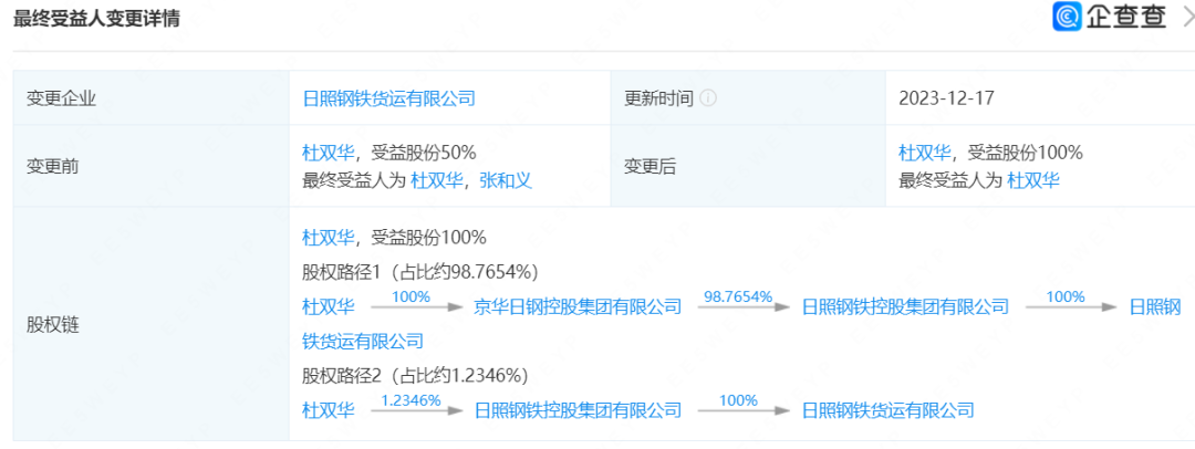 此外,日照钢铁货运有限公司的最终受益人,也从“杜双华,张和义”变更为“杜双华”,杜双华的最终受益股份从50%上升到100%。