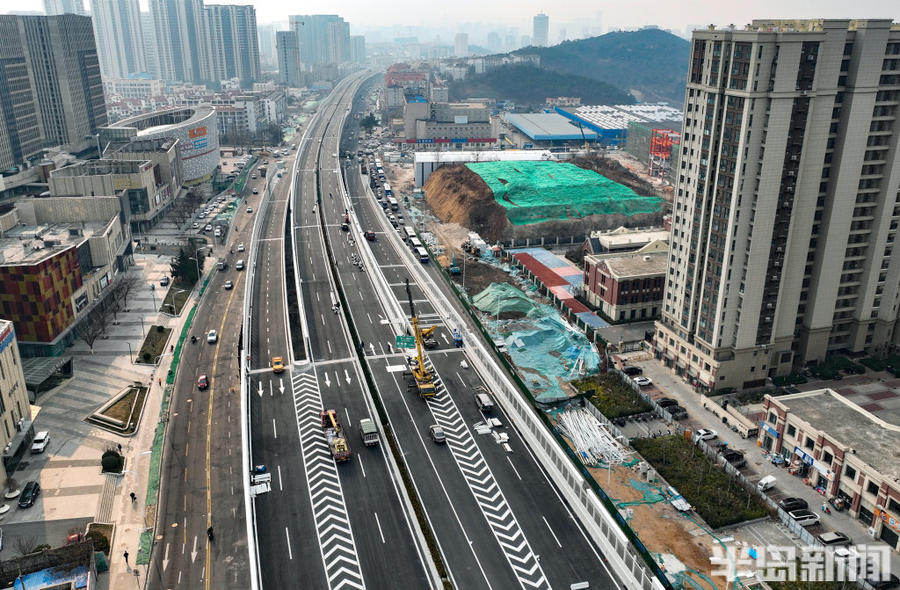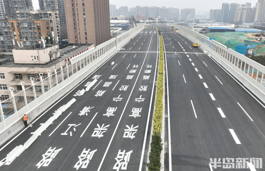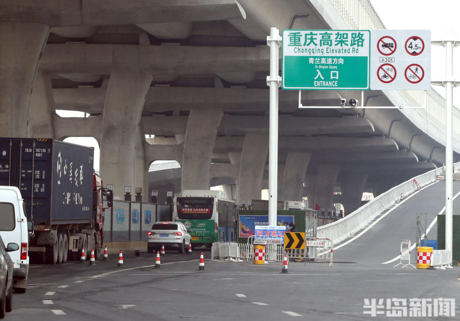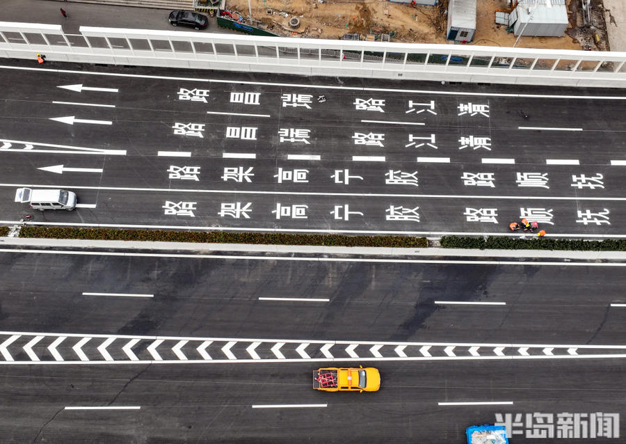 记者注意到,从山东路的始点开始,多处匝道进出口正在进行最后施工,入口处标有“重庆高架路”。记者利用航拍设备在高空俯拍,道路上已经设置交通标线和指示牌,不少地方的摄像头也安装到位,施工车辆在高架路上穿梭,施工人员在进行收尾工作。放眼望去,整条高架路十分气派。