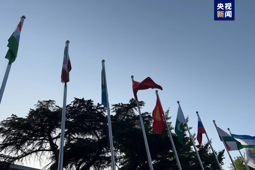 4日下午,伊朗国旗(左二)在位于北京的上合组织秘书处升起,标志着伊朗正式加入“上合大家庭”。图源:央视新闻