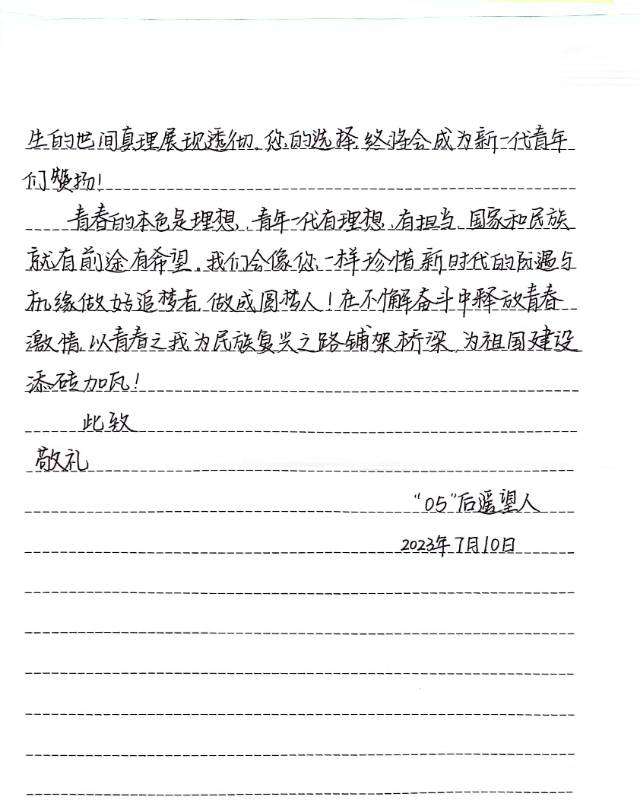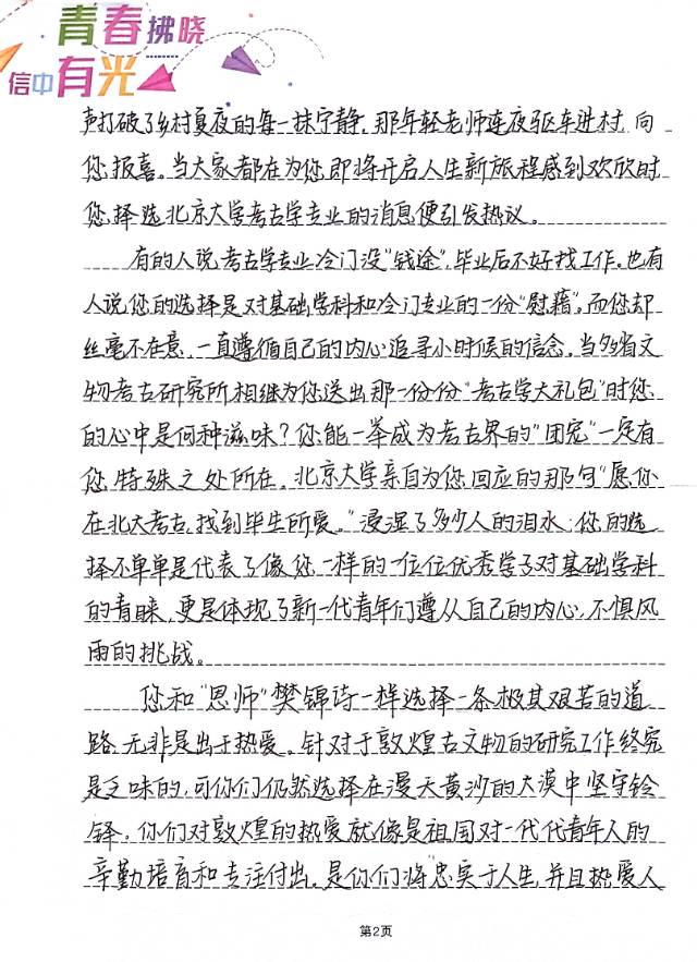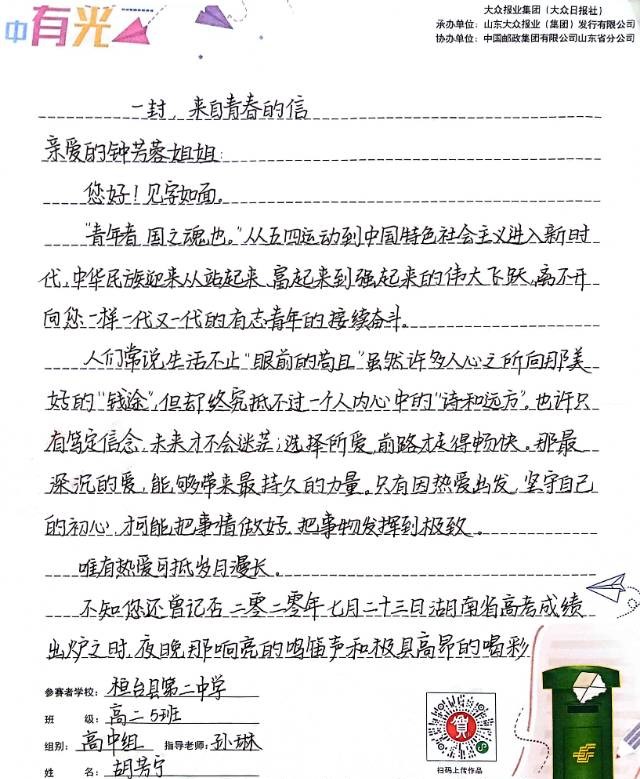 山东省第二届青少年书信文化活动获奖作品展播高中组 二等奖姓名:胡芳宁组别:高中组学校:淄博桓台第二中学指导老师:孙琳
