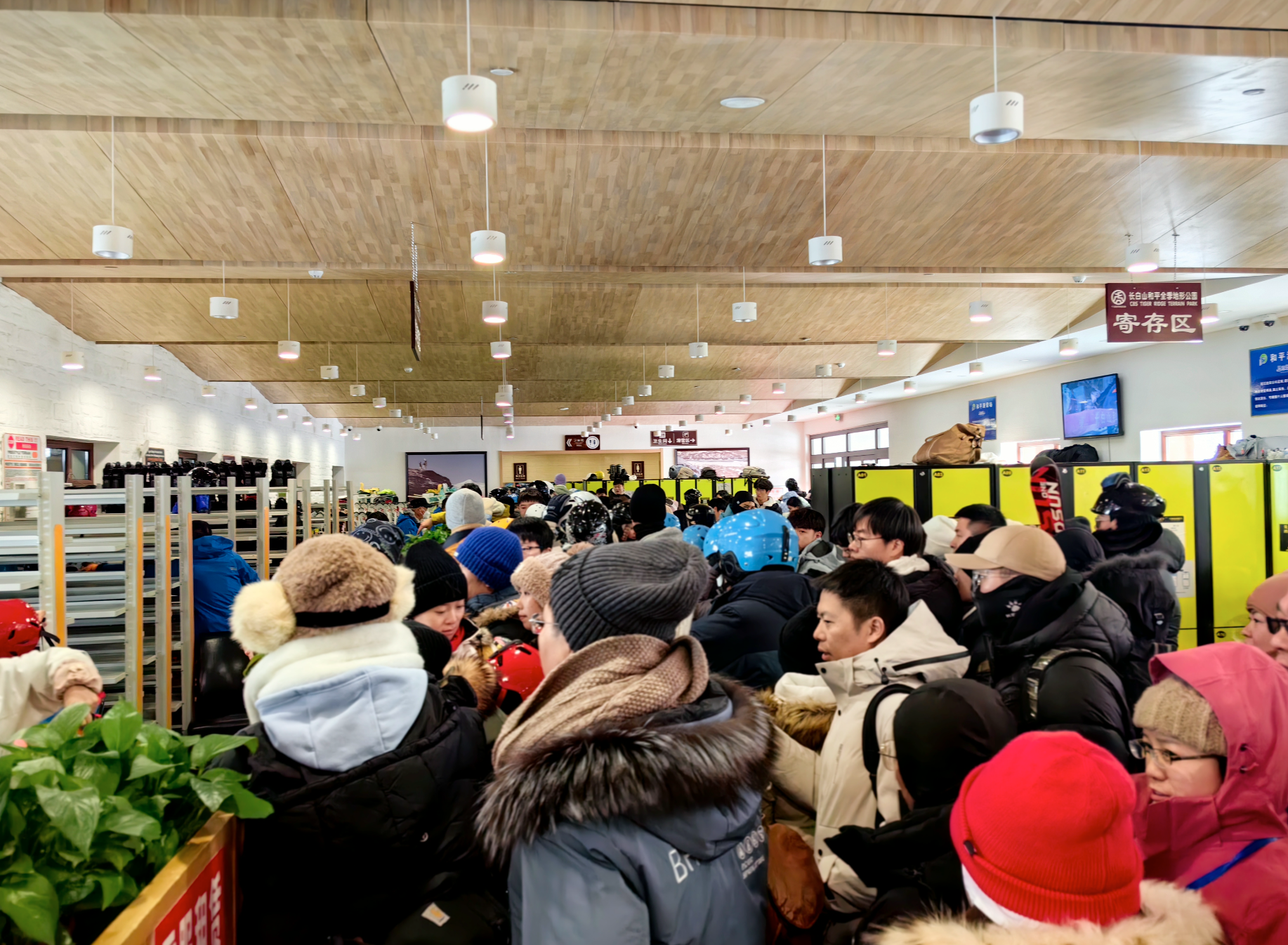 和平滑雪场滑雪设备租赁区,大批游客排队领取雪具。