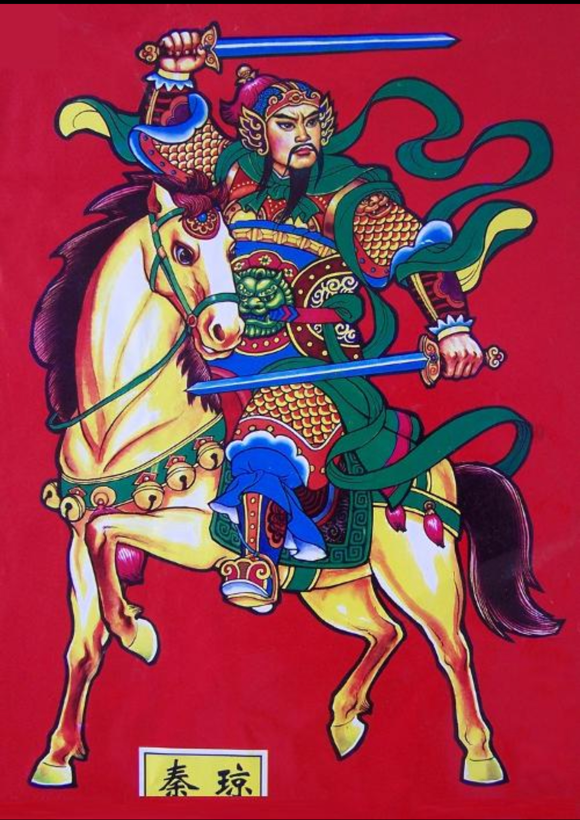 我不禁想起第三个秦琼,民俗中的“门神秦琼”。据说唐太宗李世民在发动玄武门之变,杀了争夺皇位的亲兄弟后,宫里夜夜闹鬼,他不得安睡。这时大将秦琼和尉迟恭主动站了出来,夜夜在宫门为皇上站岗。后来皇上觉得他们太劳累,就将他们的头像画于宫门上,以此镇妖慑鬼。据说这也是中国春联的起源。