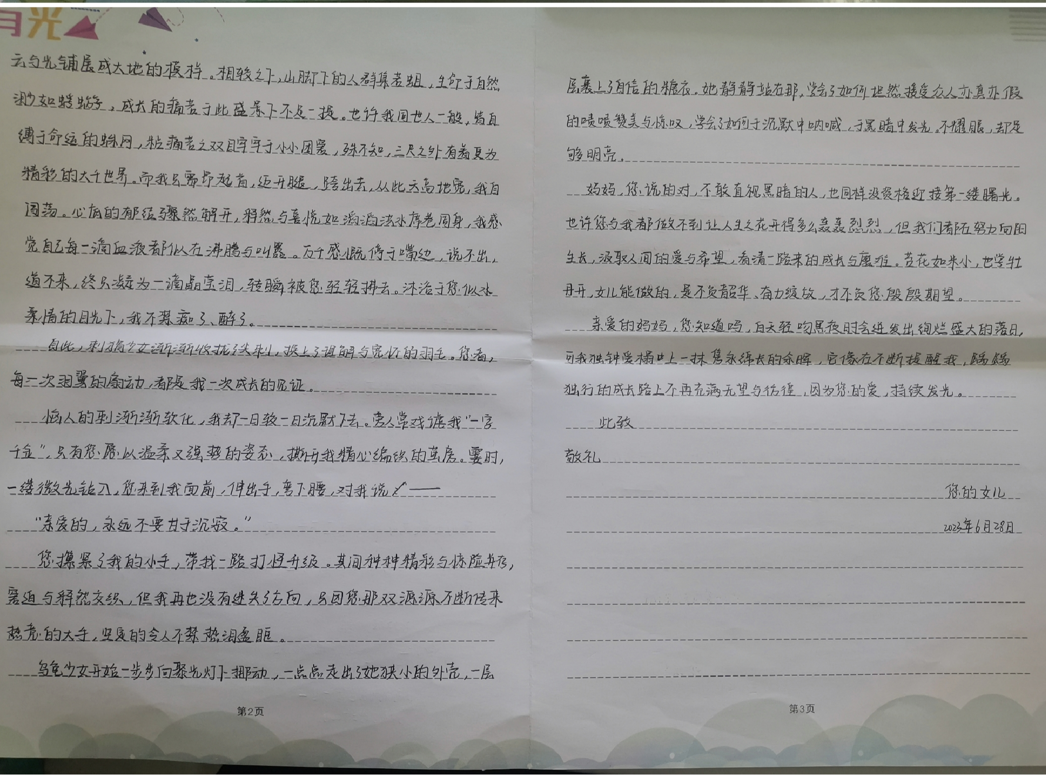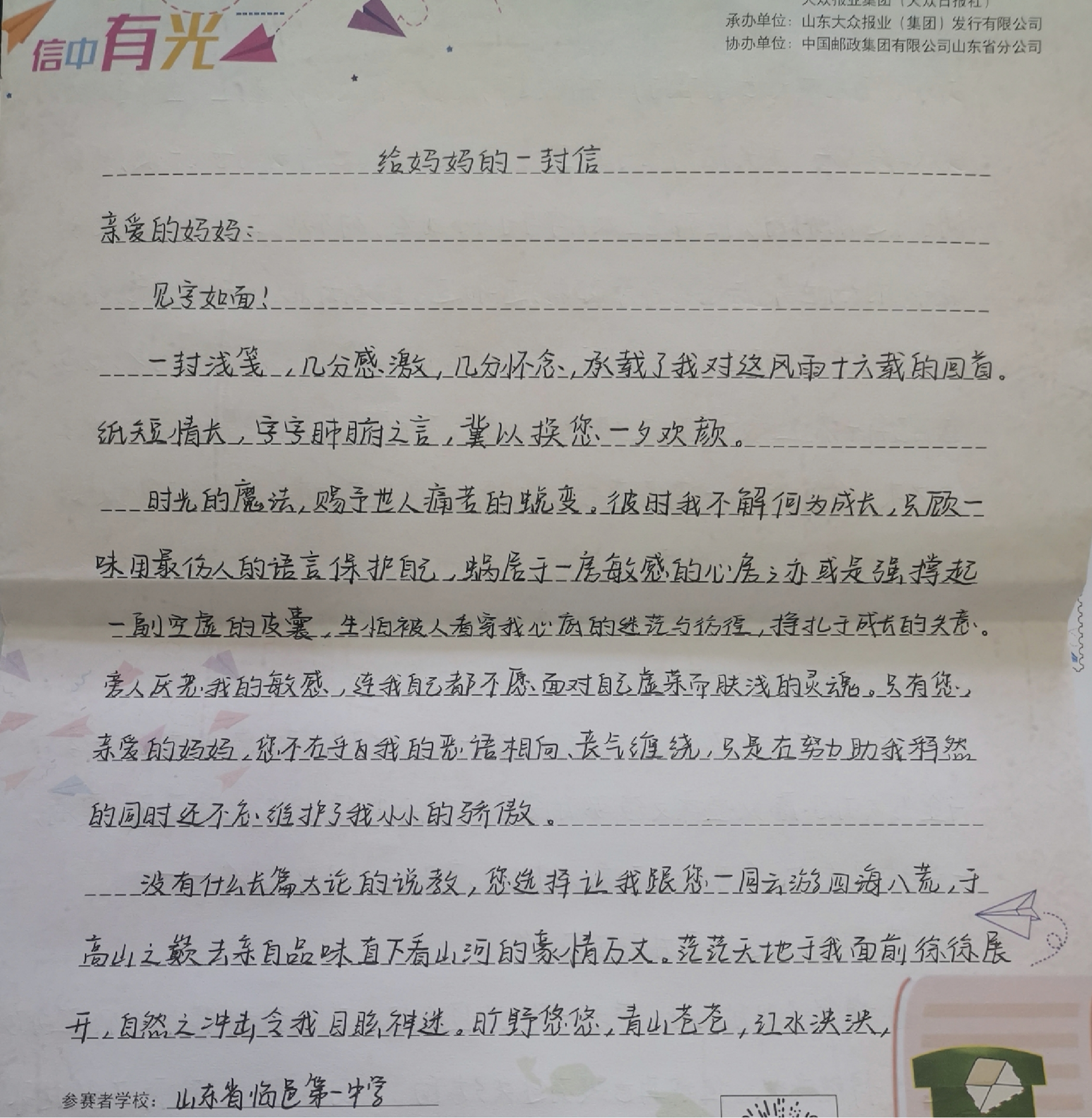 山东省第二届青少年书信文化活动获奖作品展播高中组 二等奖姓名:李金熙组别:高中组学校:德州市临邑第一中学指导老师:曹璐璐
