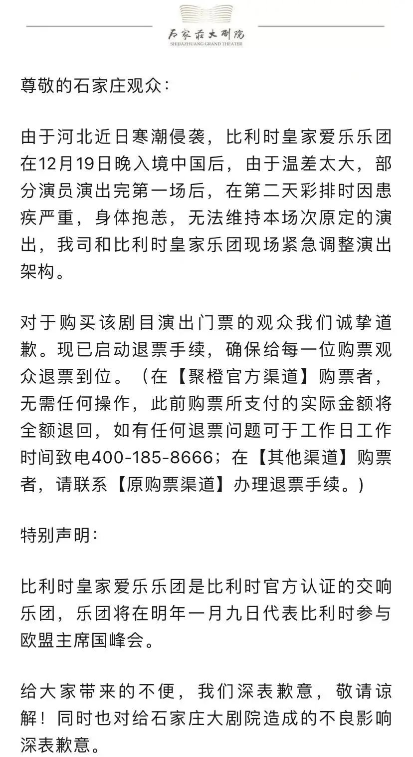 12月22日,比利时皇家爱乐乐团2024新年音乐会在石家庄大剧院演出。一名现场观众告诉记者,当晚检票时间推迟,乐团演出迟到,前面表演了一些独奏,“以为是预热,结果表演了半个小时。”该观众表示,当晚演出正式表演时间较短,演出跳过了很多预告曲目,到了结尾处还出现重复曲目的演奏。演出时,就有观众表达不满,结束后不少观众高喊退票。另一名观众谈到,自己是被演出信息吸引,特地带着家人去看,但观演体验很糟糕。演出信息介绍显示,比利时皇家爱乐乐团合奏基于1740年,其前身是驻罗马Cracow皇家教廷御用音乐典礼唱诗乐队,有超过400多年在罗马Cracow皇家教堂里表演的传统。比利时独立后,此乐团成为比利时王国唯一一个拥有欧洲400多年历史的欧洲级国家宫廷爱乐乐团。12月22日该乐团在石家庄大剧院的演出票价在180元到580元不等。12月23日,石家庄大剧院发布道歉声明:比利时皇家爱乐乐团在12月19日晚入境中国后,由于温差太大,部分演员在第二天彩排时因患疾严重,身体抱恙,无法维持本场次原定的演出,我司和比利时皇家乐团现场紧急调整演出架构。对于购买该剧目演出门票的观众表示诚挚道歉,已启动退票手续,确保给每一位购票观众退票到位,此前购票所支付的实际金额将全额退回。