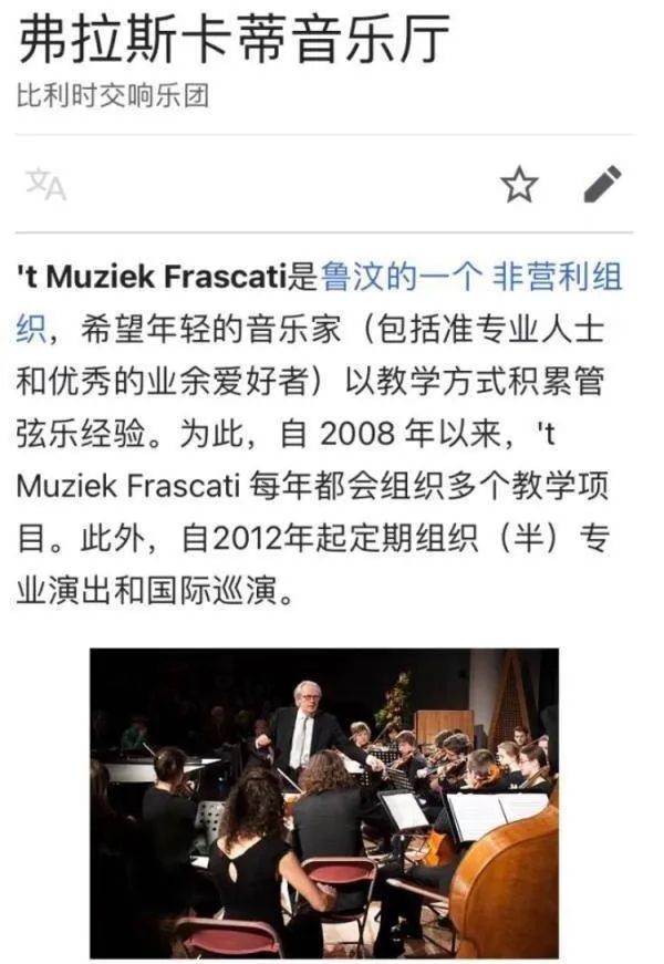 而记者通过海报上的比利时皇家爱乐乐团的外文名称T Muziek Frascati,查询到该乐团是比利时鲁汶的一个2007年成立的地方非营利性乐团,“主要是为年轻音乐家(包括准专业人士和优秀的业余爱好者)以教学方式积累管弦乐经验,从2012年开始定期组织半专业的演出和国际巡演……2013年更名为弗拉斯卡蒂交响乐团,以应对日益国际化的市场。”