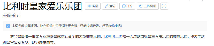 百度百科还显示,比利时皇家爱乐乐团是罗马教皇唯一指定专业演奏皇家教廷音乐的大型交响乐团,比利时王国唯一入选欧盟级皇室专用乐团的交响乐团,400年欧洲皇室演奏专享、欧洲殿堂国宝。