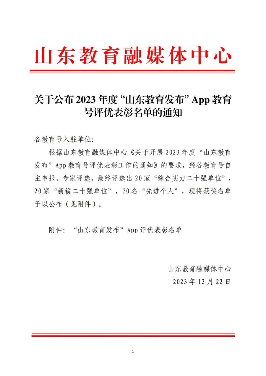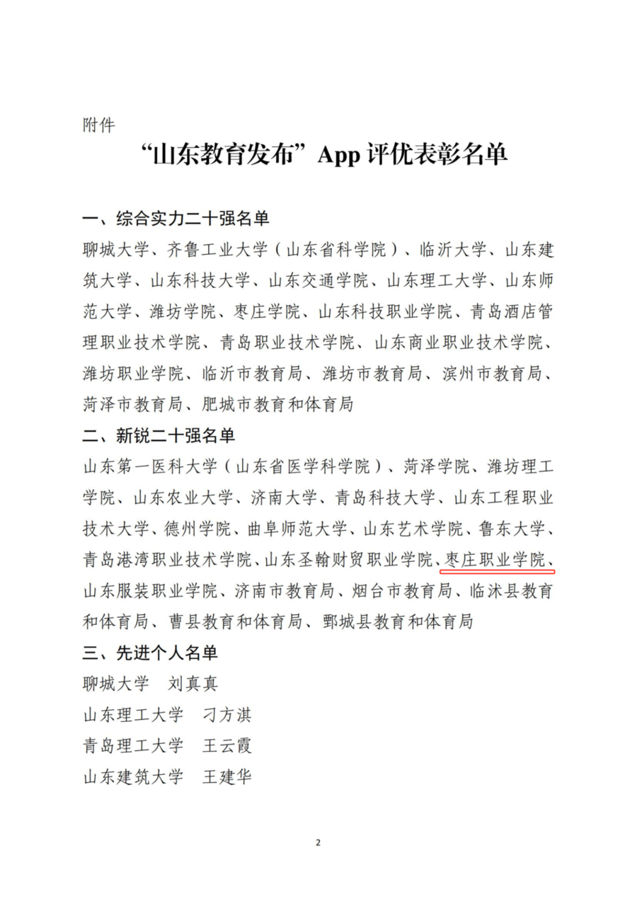 12月22日,山东教育融媒体中心对入驻山东教育发布app的山东省先进单位评优表彰。枣庄职业学院从全省入驻的683个单位中脱颖而出,获评“新锐二十强单位”。