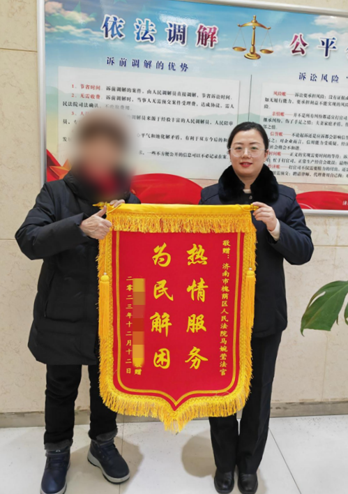 面对当事人无法出庭、取证困难等问题,法官耐心地提供了多种解决问题的思路和方法,当事人豁然开朗,积极准备相关手续和证据,调解员也表示又学习到了解决问题的新技能。原告崔某感动于法官帮助当事人解决问题的热心和耐心,向马婉莹法官送来锦旗表示感谢。槐荫法院在审判工作中一直秉持司法为民的服务宗旨,用“有解思维”帮助当事人化解难题,努力实现司法公平公正和司法高效便民的有机统一。(济南市槐荫区人民法院)