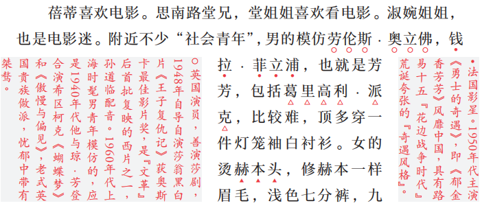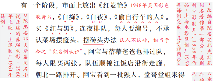 阿宝一直无法忘怀的儿时好友蓓蒂爱看电影,阿宝时常陪蓓蒂一起去看,小说中提到的电影有《王子复仇记》《百万英镑》《罗马假日》《白痴》《白夜》《偷自行车的人》《红与黑》等。