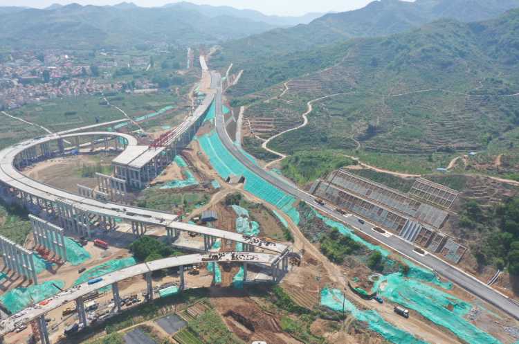 2023年5月,空中俯瞰在建的临临高速鲁山互通C匝道桥建设项目。