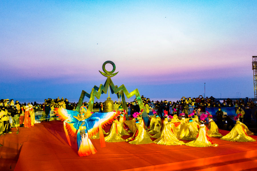 迎日仪式经典延续,祈福活动全新升级。除了广大市民游客熟悉的祈福大典仪式和敲钟环节外,演员还将在迎日祈福大典结束后,从演艺广场向北巡游至万平石,通过舞龙表演、场景再现等方式,开展行进式演出,近距离为市民游客展现日照太阳文化魅力。