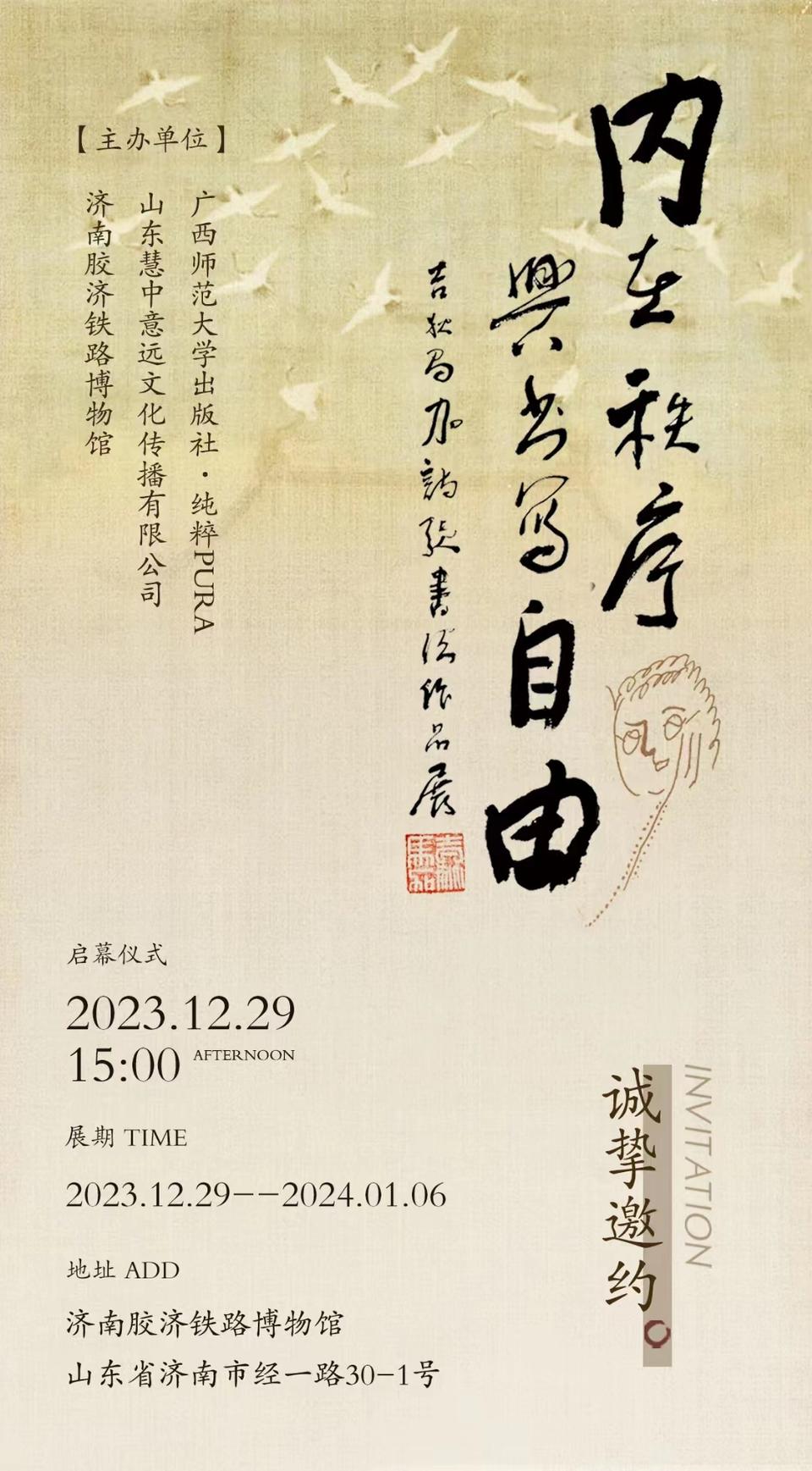 12月29日下午,“内在秩序与书写自由:吉狄马加诗歌书法作品展”在济南胶济铁路博物馆举办开幕式。此次共展出书法作品百余幅,展期为9天。该展览由广西师范大学出版社·纯粹Pura、山东慧中意远文化传播有限公司、济南胶济铁路博物馆主办。
