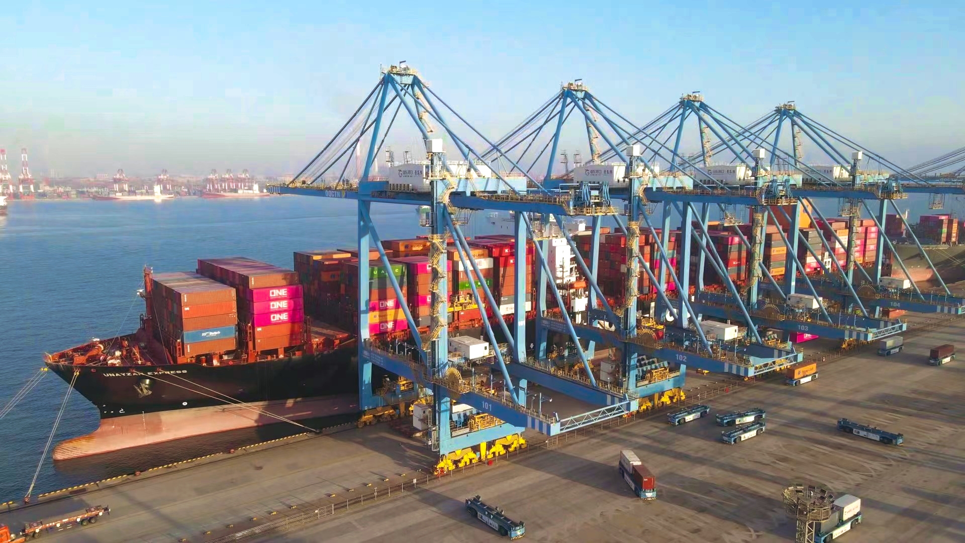 记者在现场看到,靠泊在山东港口青岛港前湾港区集装箱自动化码头的“乌奈札快航”正在装载货物。