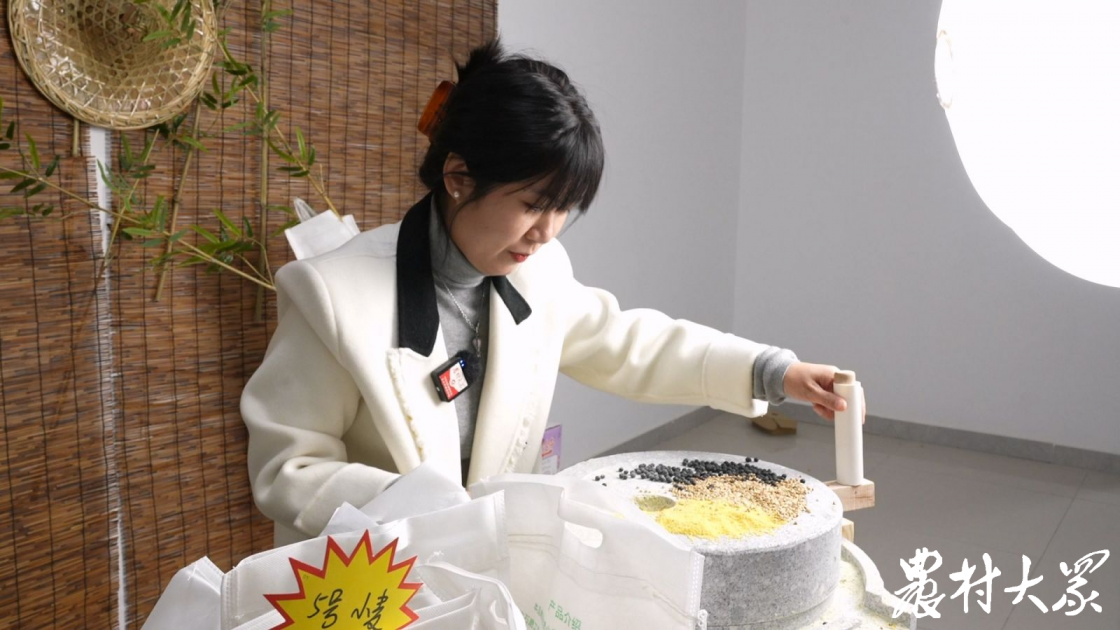 农产品销售直播间内,摆放着可使用的石磨。