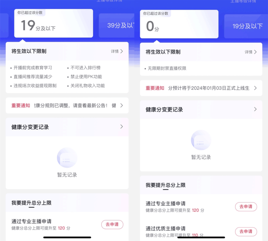 例如,此前一名以展示唱歌为主的女主播,因着装不当,在“健康分”制度试运行初期多次被扣分。后来,她开始改变直播风格,以健康积极的画面出现,并在重新回到100分后,申请了优质主播认证,直播数据也有了小幅度的上升。