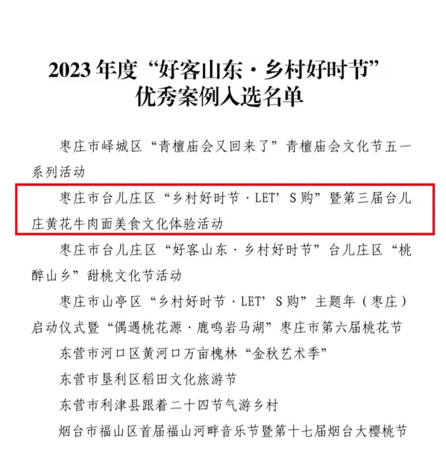 近日,山东省文化和旅游厅公布2023年度“好客山东·乡村好时节”优秀案例。台儿庄古城“乡村好时节·LET'S购”暨第三届台儿庄黄花牛肉面美食文化体验入选特色主题活动名单。