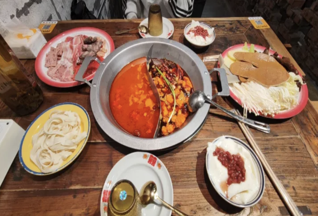 含锅底,2人份小料,羊肉、牛肉、羊肉丸、鸭血、娃娃菜、炸腐皮各1份,额尔敦老酸奶2份。