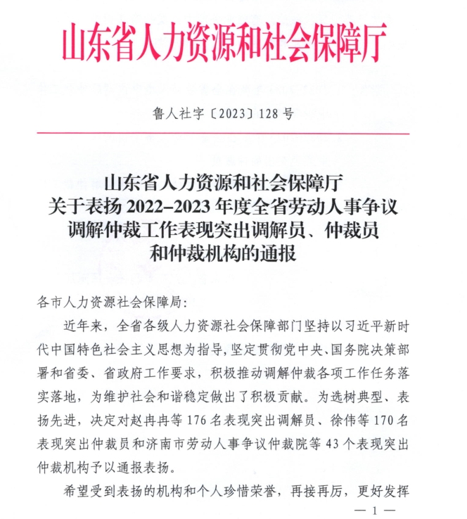 枣庄14个人2集体上榜!省人社厅表彰2022至2023年度仲裁工作先进