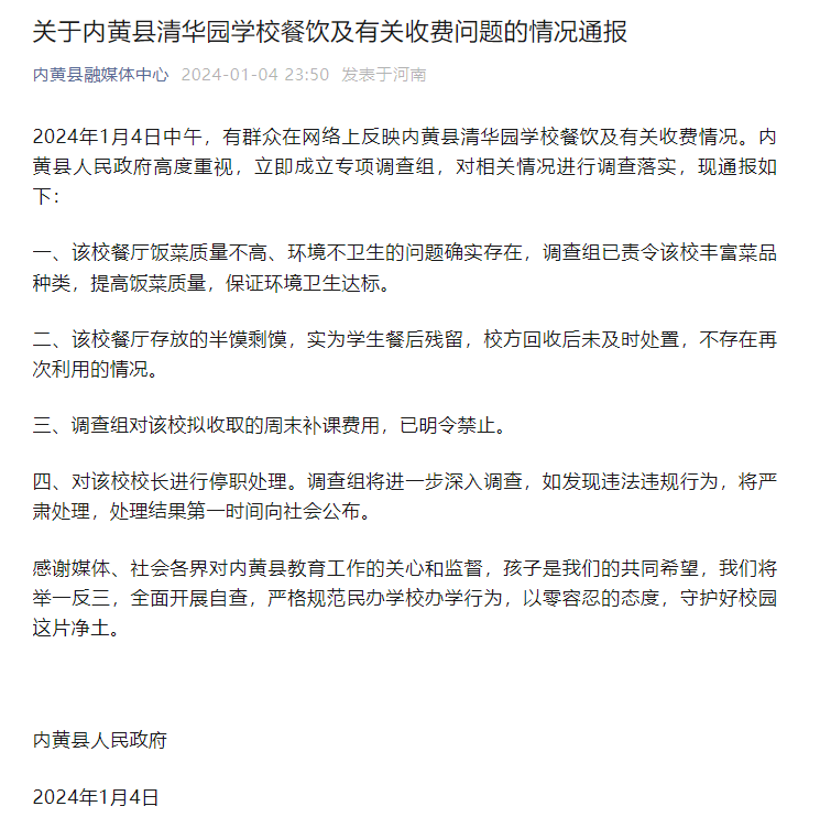 2024年1月4日中午,有群众在网络上反映内黄县清华园学校餐饮及有关收费情况。内黄县人民政府高度重视,立即成立专项调查组,对相关情况进行调查落实,现通报如下: