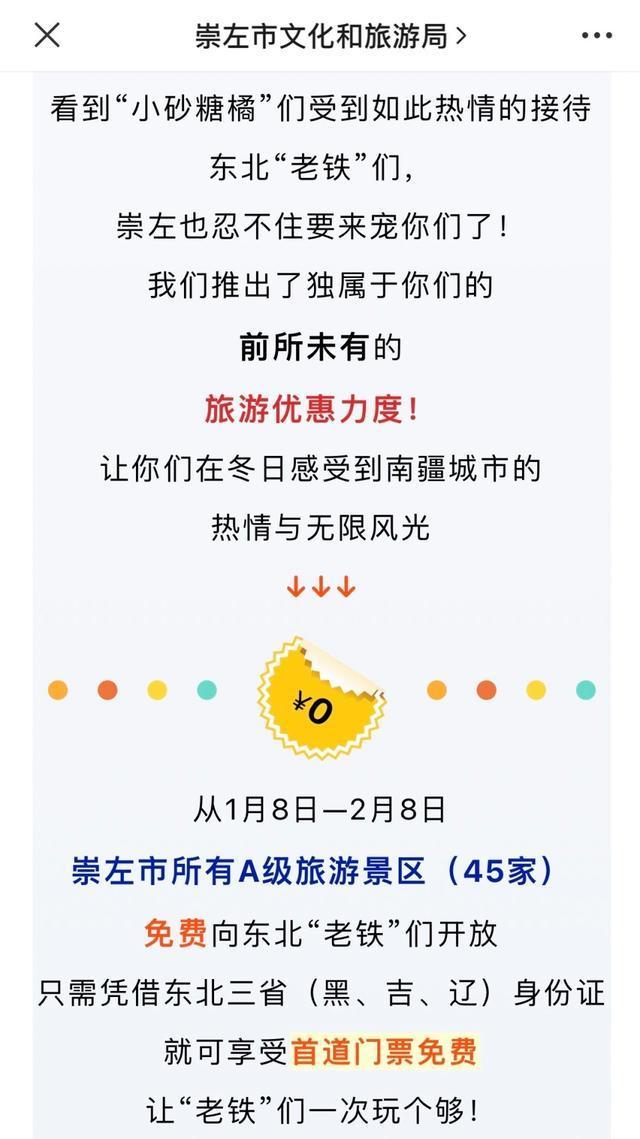 为感谢东北老铁对“小砂糖橘”的贴心照顾,1月8日至2月8日,南宁大明山风景区对东北三省游客实行免门票优惠;广西崇左市文化和旅游局方面称,1月8日至2月8日,崇左市所有A级旅游景区(45家)将免费向东北游客开放,只需凭借东北三省(黑、吉、辽)身份证,就可享受首道门票免费。