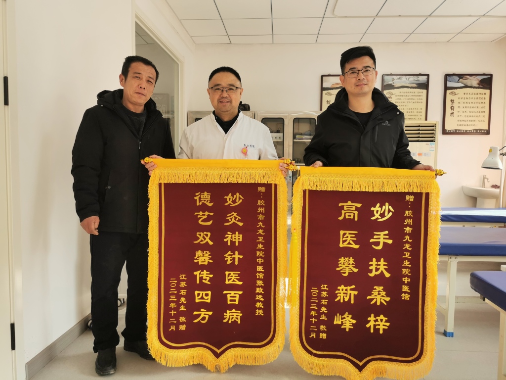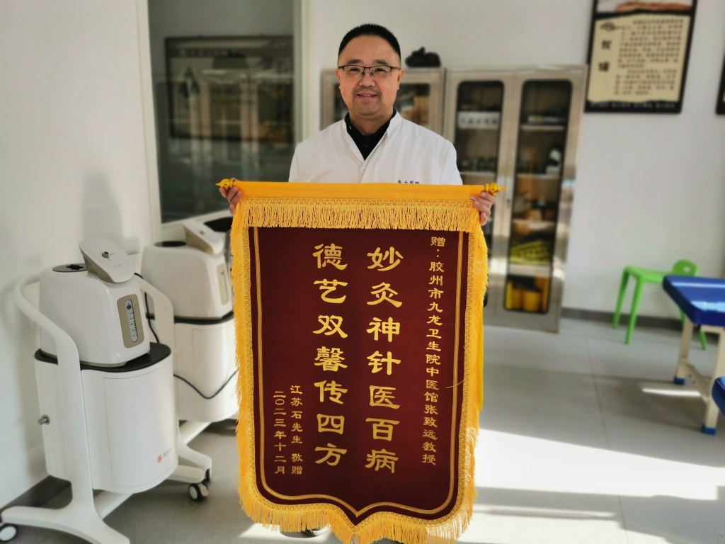 近日,胶州市九龙街道九龙卫生院中医馆张致远医生收到了一面锦旗,这是他的“老”病号石先生专程送过来的,以表达对他的感激之情。
