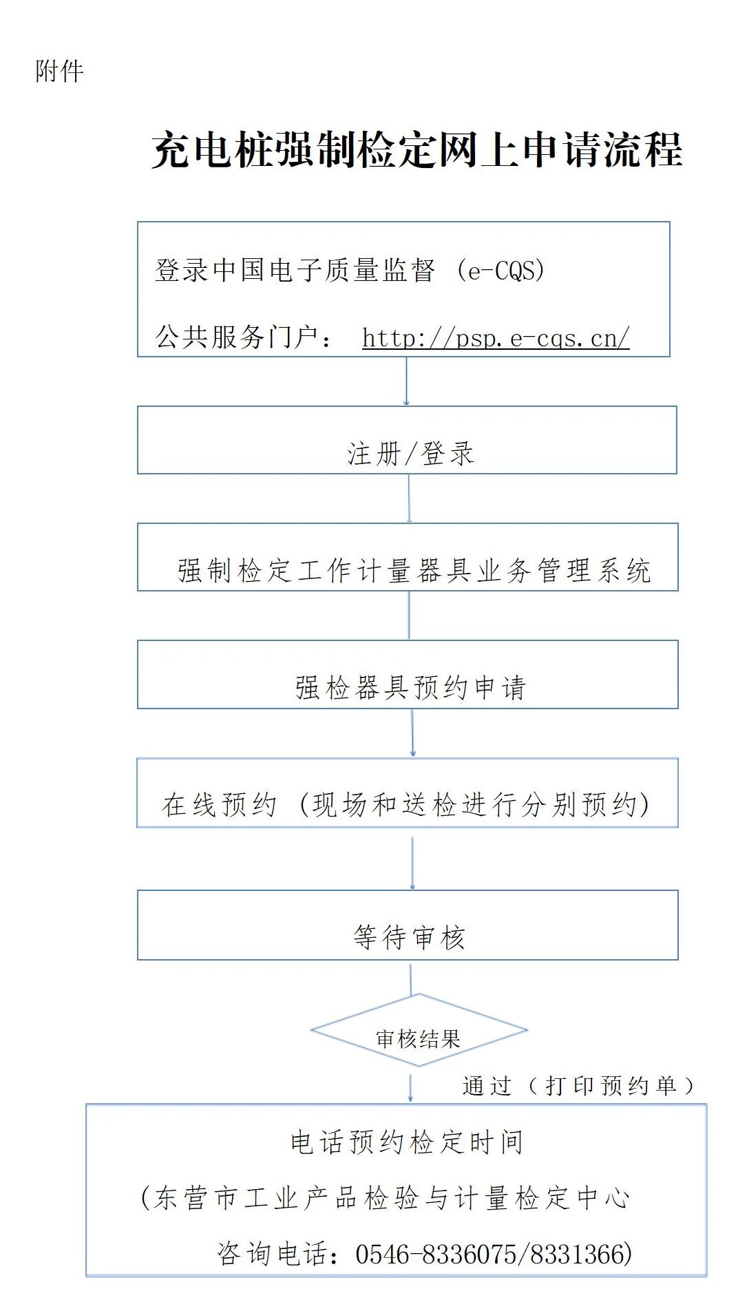 强制检定工作实施。各充电桩运营单位要及时将电动汽车充电桩登记造册,报当地市场监督管理局备案,同时通过“中国电子质量监督(e-CQS)”平台(https://www.e-cqs.cn/)预约申请周期检定,东营市工业产品检验与计量检定中心根据预约完成检定任务,详细流程见附件。东营市工业产品检验与计量检定中心业务咨询及联系电话:0546-8336075/8331366