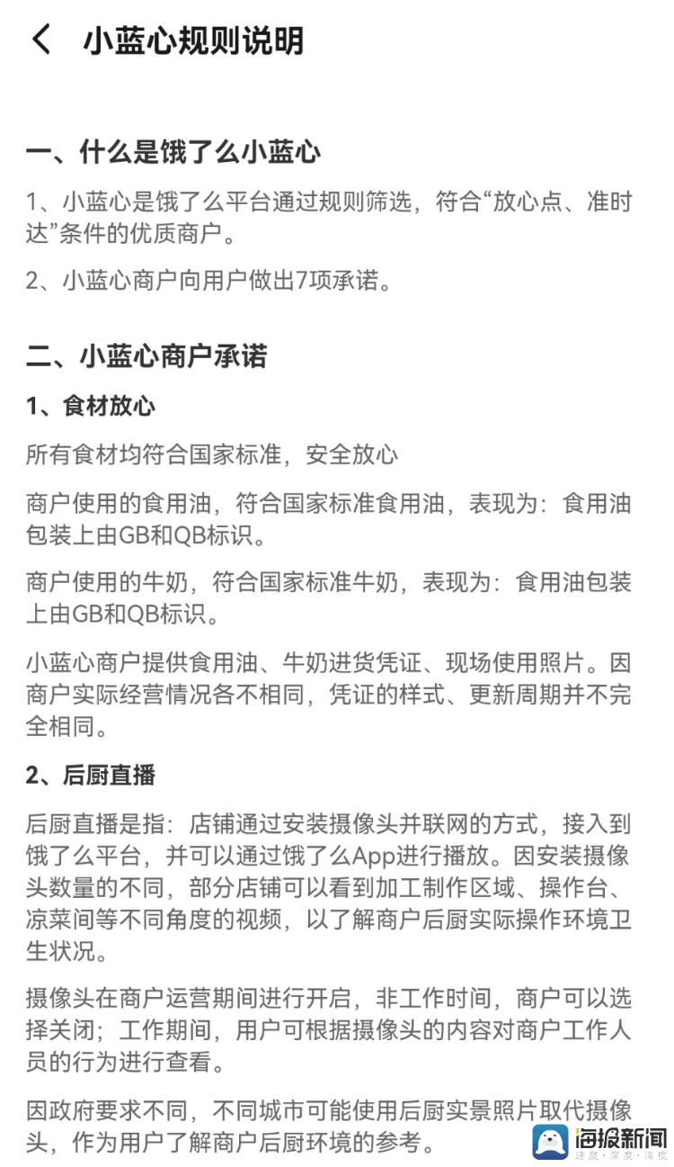 小蓝心规则显示,摄像头在商户运营期间进行开启,非工作时间,商户可以选择关闭;工作期间,用户可根据摄像头的内容对商户工作人员的行为进行查看。因要求不同,不同城市可能使用后厨实景照片取代摄像头,作为用户了解商户后厨环境的参考。