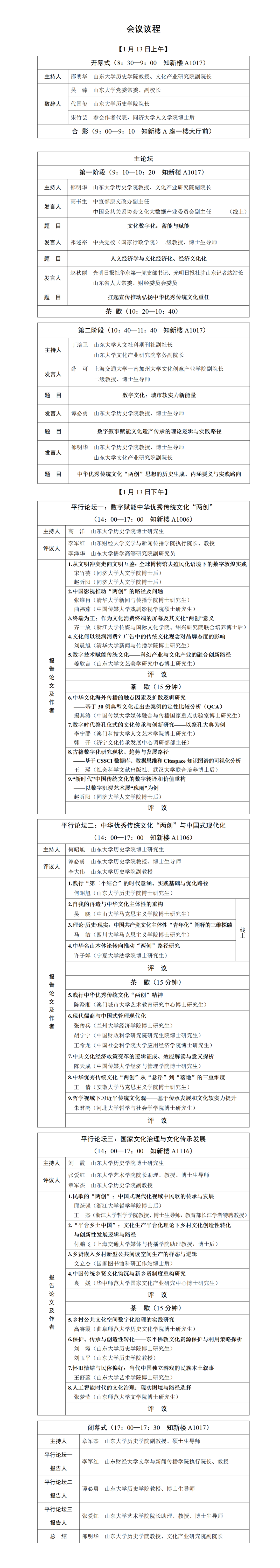 为推动中华优秀传统文化创造性转化与创新性发展,加强文化产业与中华优秀传统文化“两创”领域交叉创新研究交流,山东大学历史学院、山东大学文化产业研究院将于2024年1月13日,在山东大学中心校区举办“山东大学文化产业与中华优秀传统文化‘两创’博士后交叉创新论坛”。论坛将为文化产业有效推动中华优秀传统文化“两创”搭建山大平台、贡献山大力量。现发布论坛议程如下。