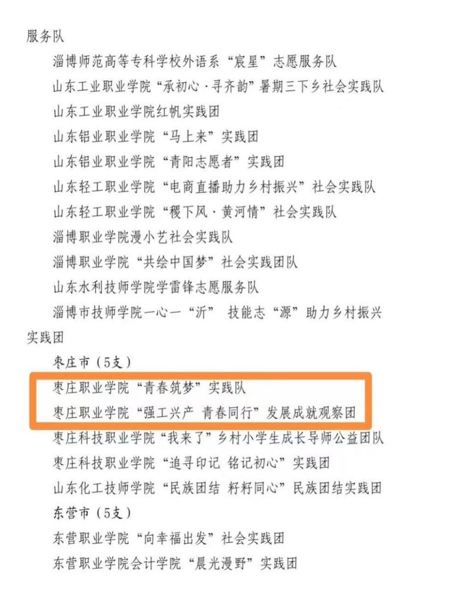 近日,山东省公布2023年暑期“三下乡”社会实践优秀集体和个人,枣庄职业学院团委获得优秀组织单位、6名教师获得优秀指导教师、13名学生获得优秀学生、2个实践队获得优秀服务团队。