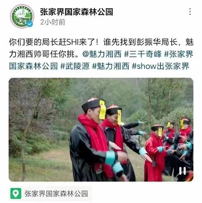 1月16日,一张网传截图引发热议,截图显示,疑似张家界国家森林公园官方账号发布一则带视频的动态,多人穿着湘西赶尸的服饰,有人还做着僵尸的动作。动态中配文,疑引导网友在扮演“僵尸”的人中,寻找张家界市武陵源区文化旅游广电体育局局长彭振华。