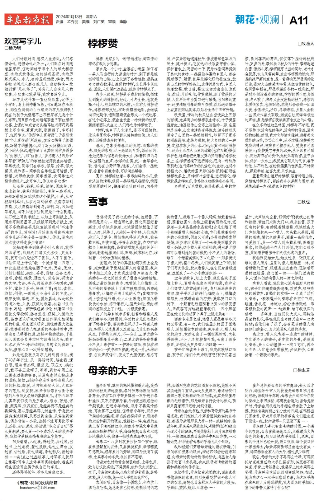 隆冬时节,凛冽的寒风横扫着大地,光秃秃的树枝无奈地摇摆。各种防寒保暖物品配备齐全,但在工作中需要露出一双手进行各种操作,又不方便戴手套,手指便出现轻微的干裂现象。已近中年的我,双手不再柔滑娇嫩,可也算不上粗糙。但母亲中年时,双手如干柴般布满裂痕,每当给我挠痒痒时,那满手的老茧和裂开的硬皮,像钢锉一样,在我的皮肤上留下清晰的红印,颇像小学课文中陈秉正那双铁耙样的大手。每每想起母亲那双饱经风霜的大手,往事一帧帧在脑海中浮现。