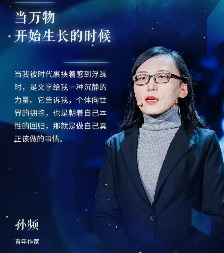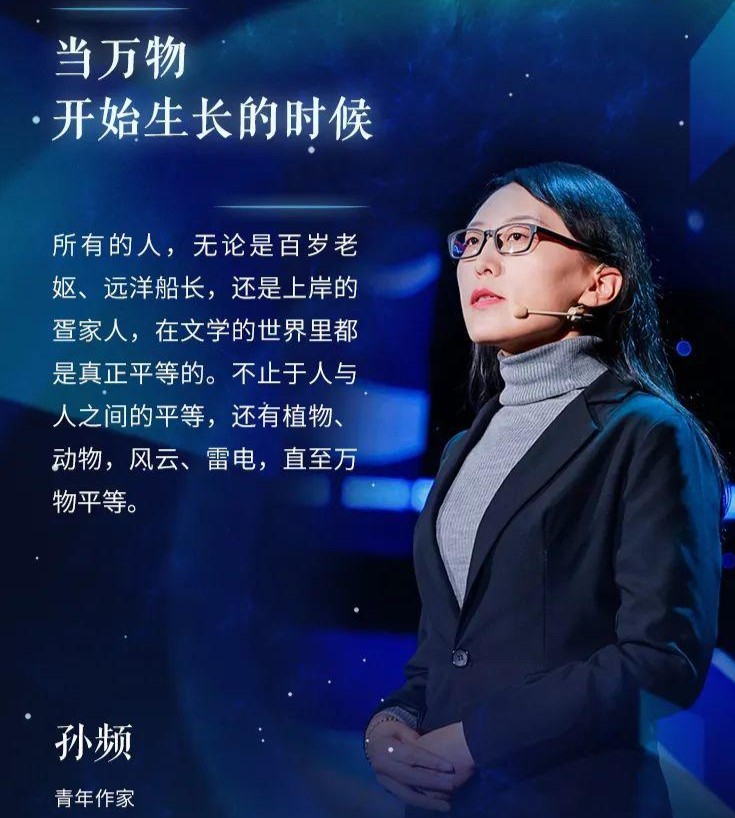 孙频认为,作品里万物平等。所有的人,乃至风云雷电,花草动物,都是一样的。在这样的书写里,孙频说,她开始逐渐明白,过一种平凡而自在的人生,也挺好的。因为文学最终会补偿一切,稀释恐惧,抚平怀疑,最终将它们化为平静和慈悲,安放所有孤独的心。