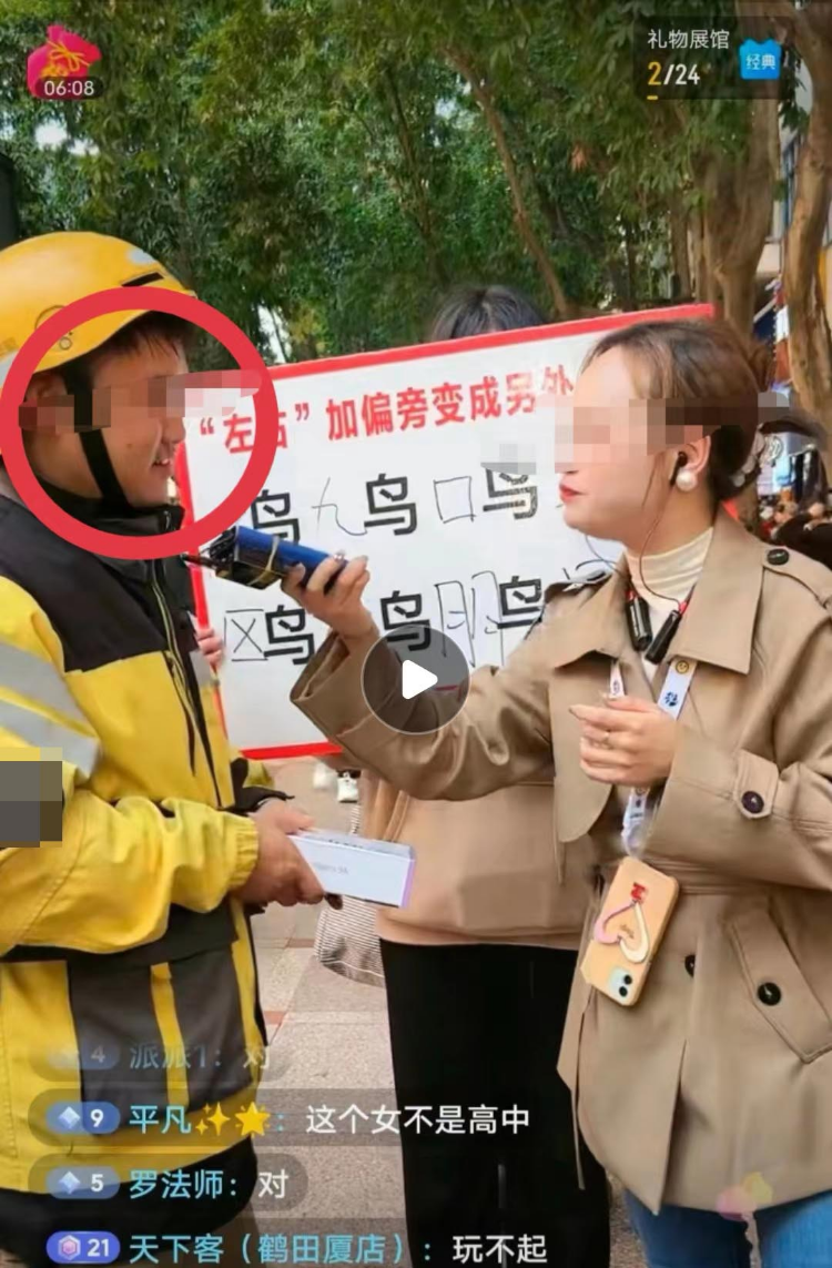 还有网友晒出视频称,经常出现在“户外东子”直播间的人员是老演员。如一位身着外卖服的小伙,一时穿黄色外卖服,一时穿蓝色外卖服。