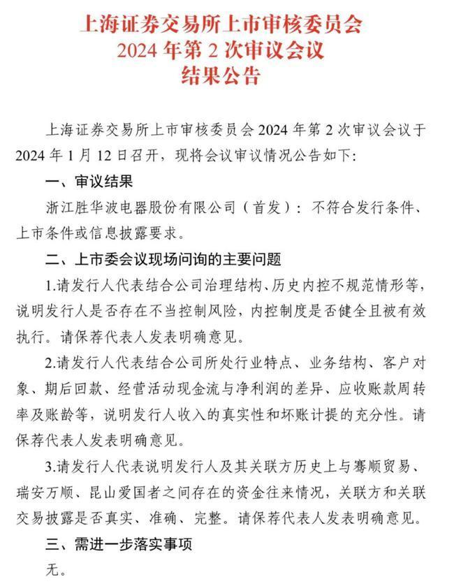 2024年,IPO首单被否案例出炉。1月12日,上交所上市审核委员会2024年第2次审议会议结果公告,胜华波(首发)审议结果为不符合发行条件、上市条件或信息披露要求,意味着胜华波的IPO之路被按下了暂停键。