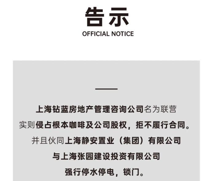 在停业告示中,根本咖啡对上海张园店停业原因作出了解释:上海钻蓝房地产管理咨询公司名为联营实则侵占根本咖啡及公司股权,拒不履行合同,并且伙同上海静安置业 (集团) 有限公司与上海张园建设投资有限公司强行停水停电,锁门。对此,根本咖啡称,已报案,并已收集了证据起诉到底。