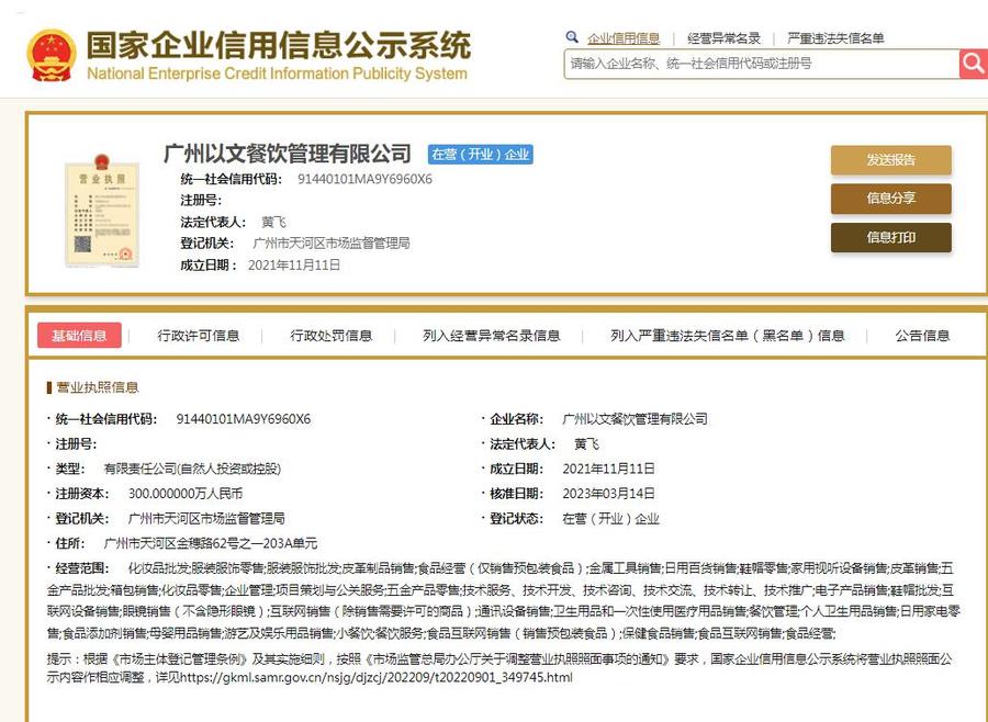 记者注意到,“根本咖啡 Grinder Coffee”公众号认证信息为广州以文餐饮管理有限公司。国家企业信用信息公示系统网站显示,该公司成立于2021年11月,黄飞为法定代表人,执行董事,经理。