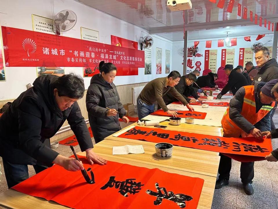 当日,诸城市还同步开展“我们的节日·春节”——诸城市社会主义核心价值观宣传教育活动、“山东手造·潍有尚品·龙城有礼”诸城非遗赶大集活动、“戏曲赶年集”文化惠民演出活动、“迎新春”民俗展演活动、喝腊八粥剪窗花共庆“腊八节”活动、“书画迎春 福满龙城”文化志愿服务活动、“摸龙骨,寻龙迹,沾‘龙运’”等多项极具“诸城特色”的乡村文化活动,琳琅满目的非遗展品、丰富多彩的文艺表演吸引了周边众多居民前来观看,热闹喜庆的节日气氛持续蔓延。