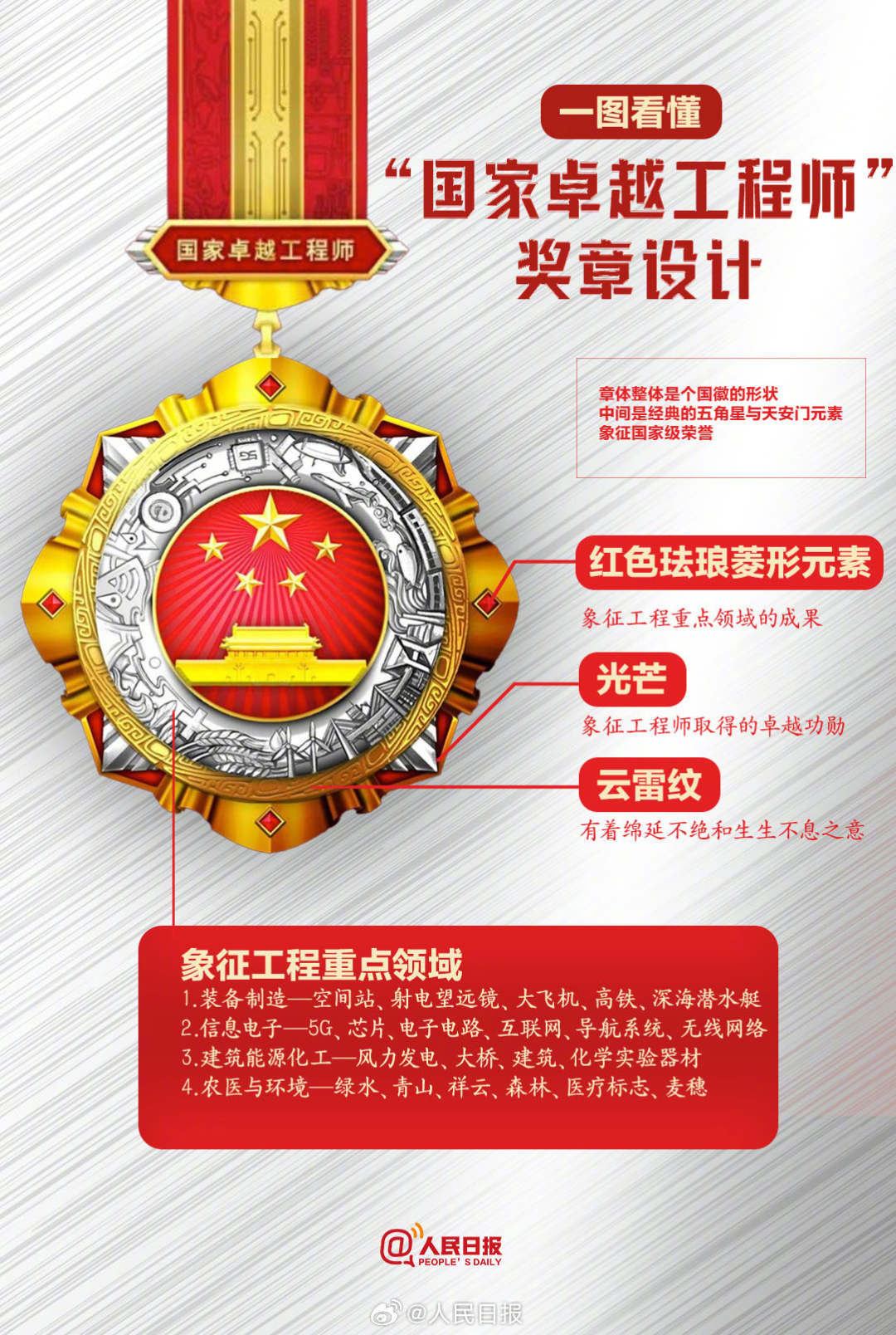 今天,“国家卓越工程师”奖章亮相。这是我国工程师领域的最高荣誉勋章。奖章选取的元素包括高铁、5G、港珠澳大桥、杂交水稻等我国具有代表性的工程技术成果。一图看懂国家卓越工程师奖章中的彩蛋!