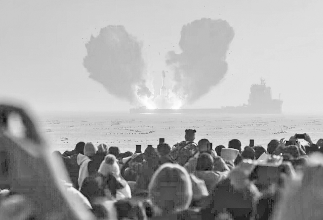 1月11日,人们在海阳市连理岛上观看海上火箭发射。