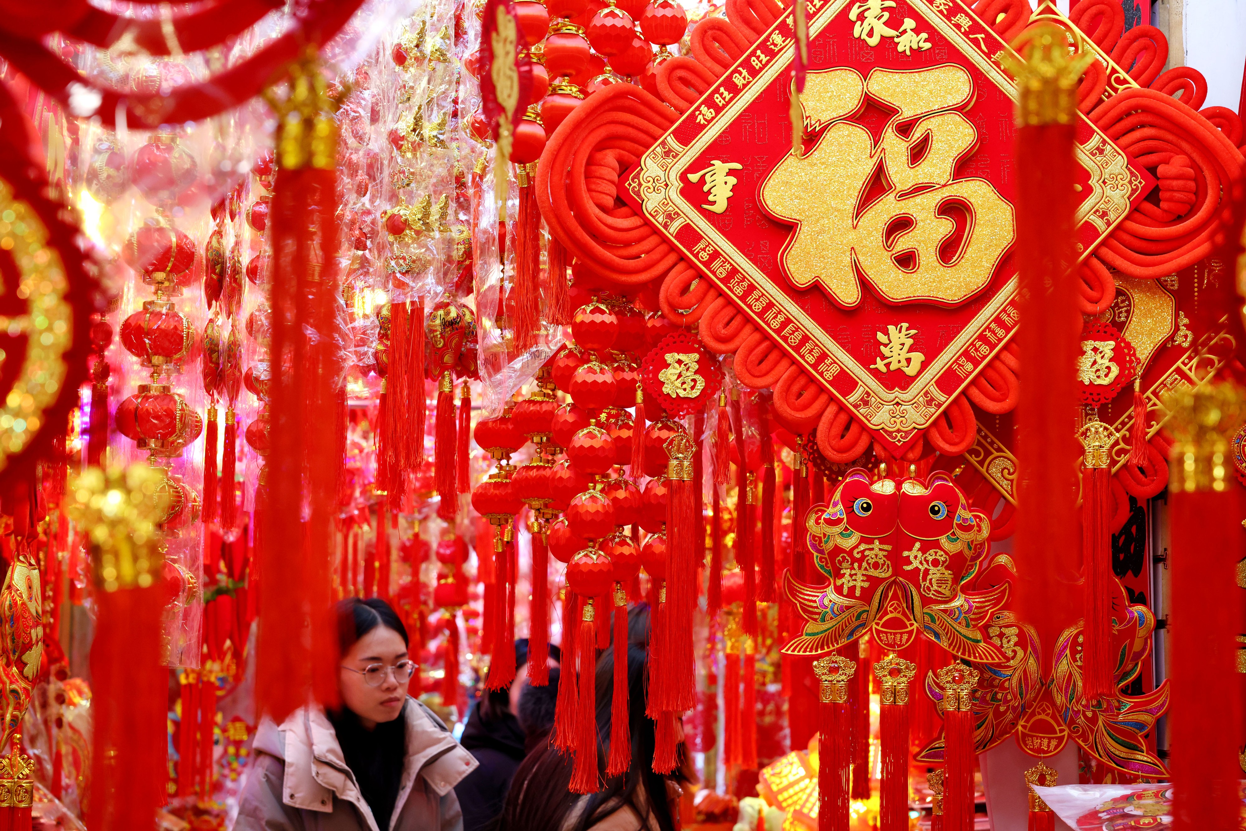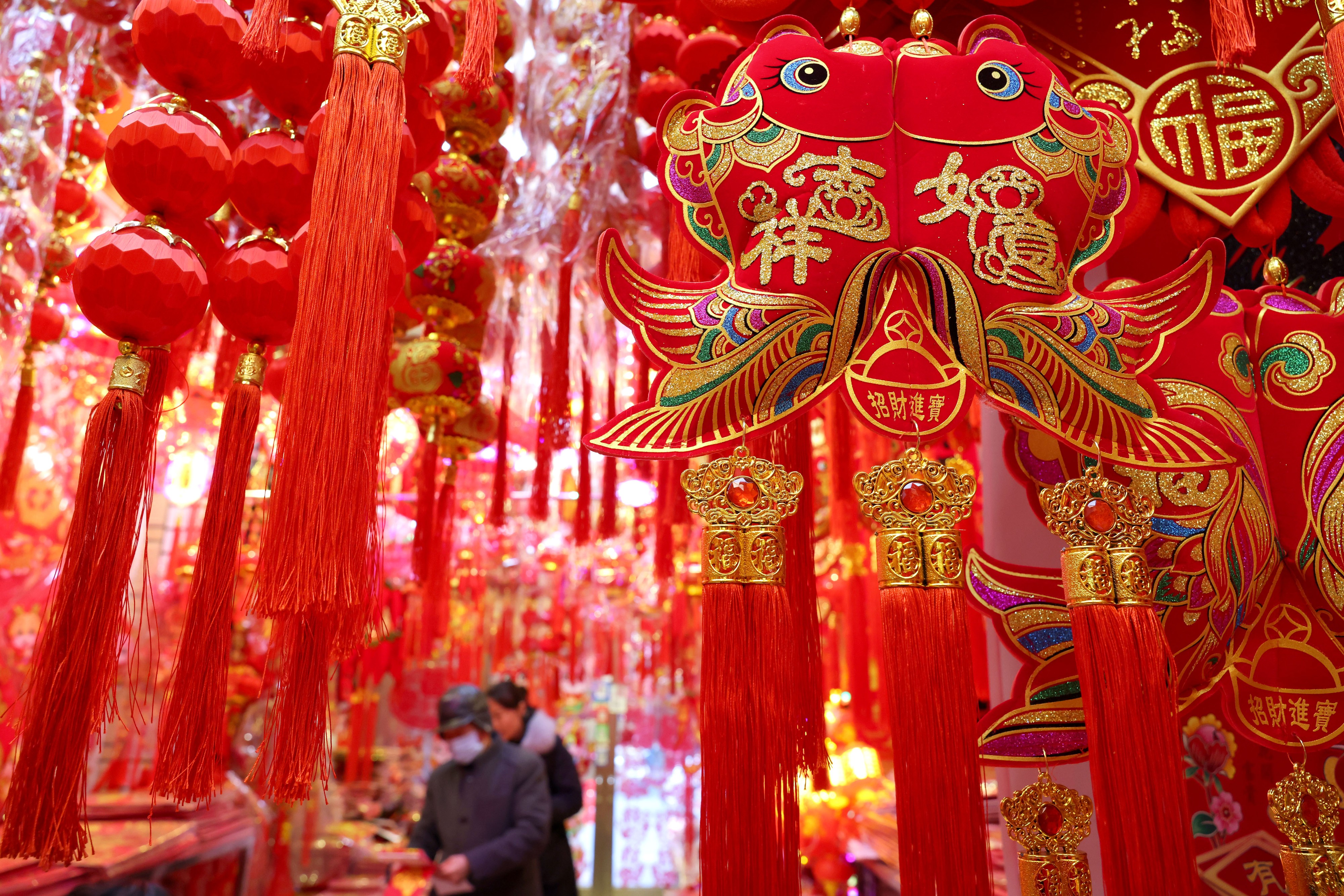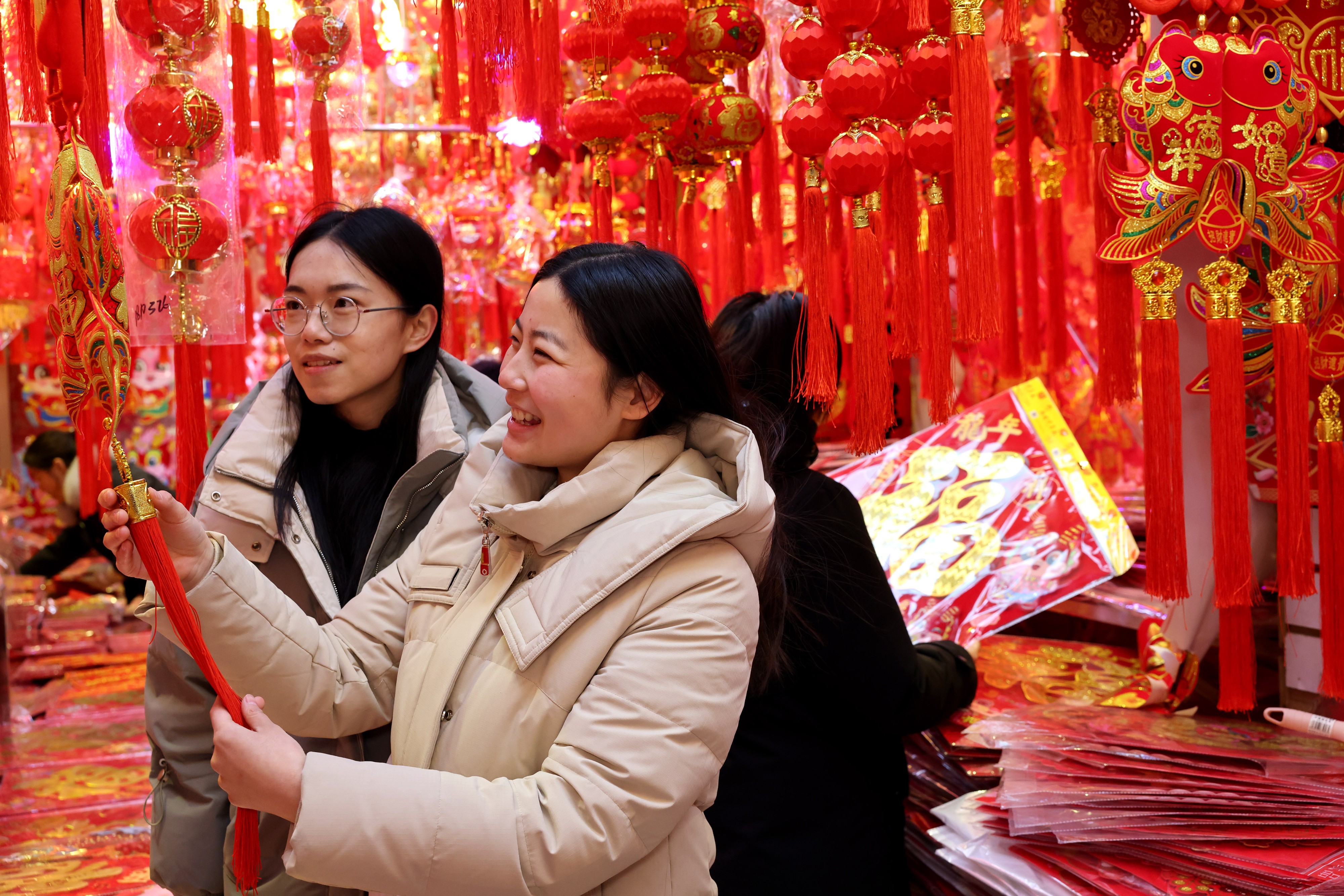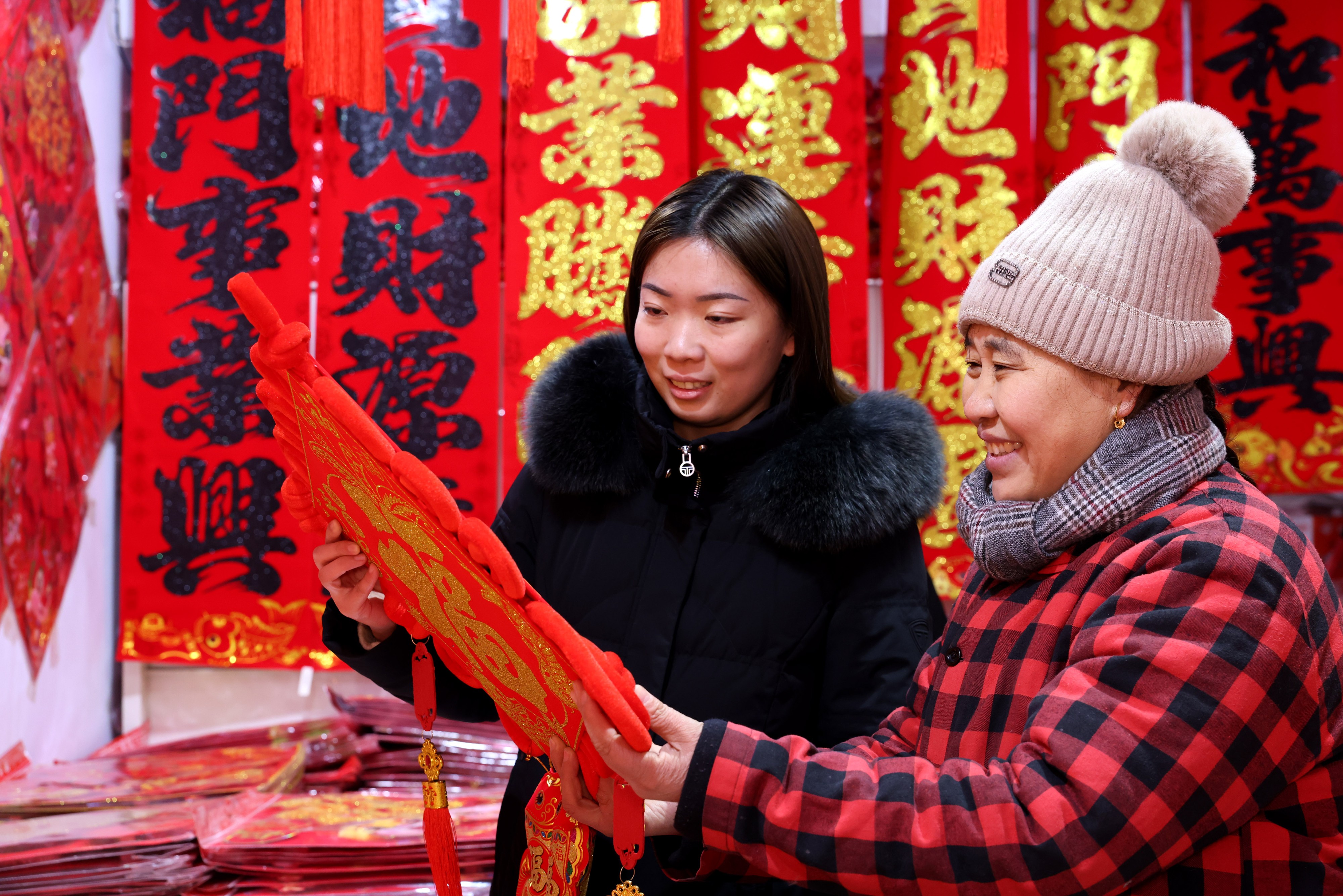 1月24日,顾客在枣庄市一年货市场选购新年饰品。春节临近,枣庄市城乡街头张灯结彩,到处洋溢着浓浓的年味,红红火火迎新春。