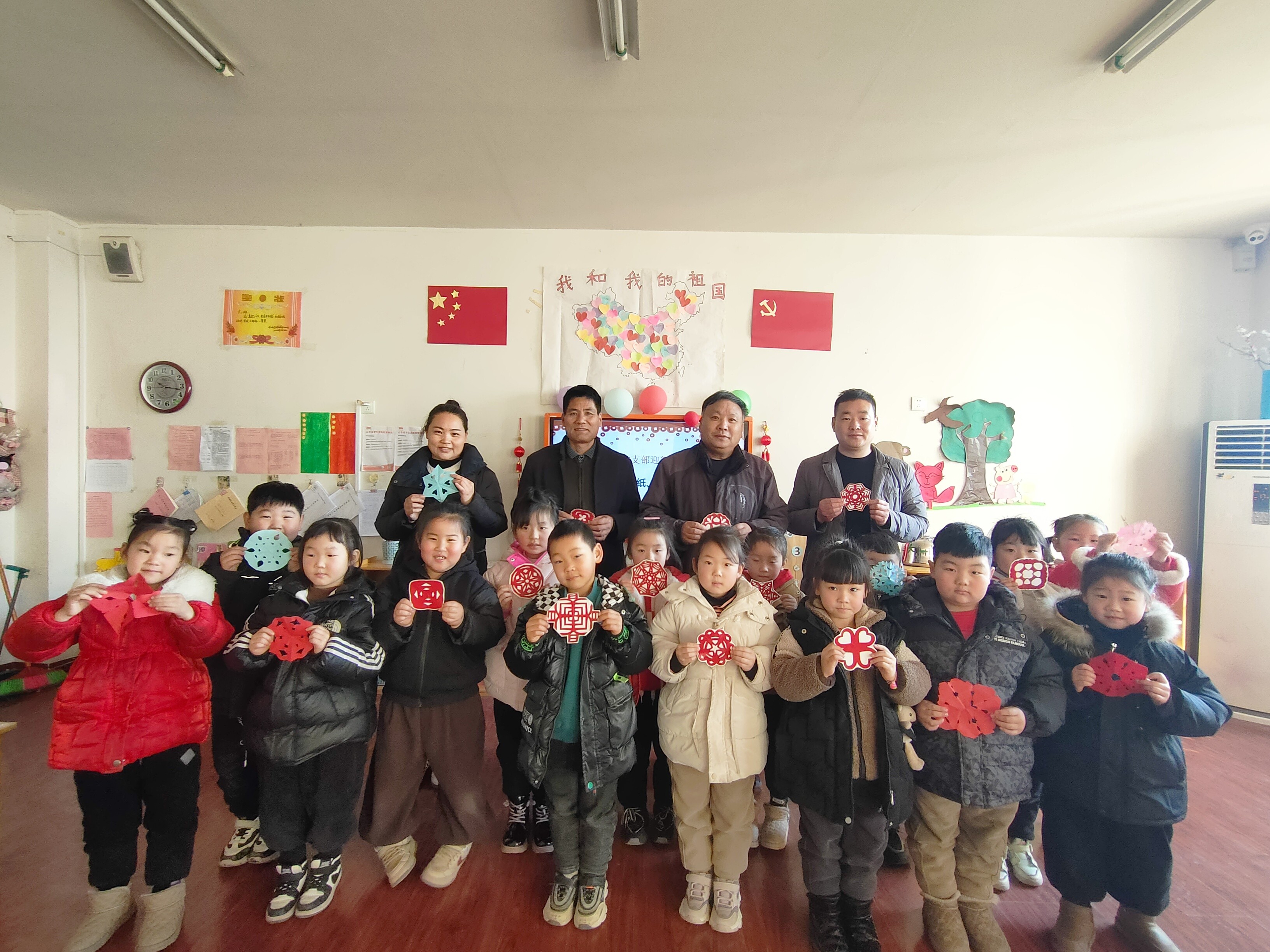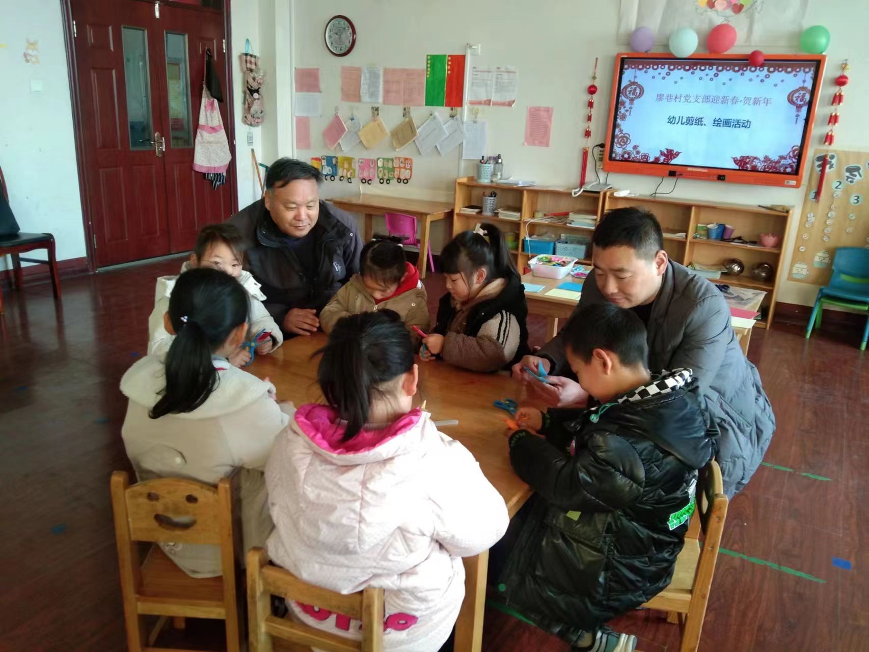 在马兰屯镇廖巷村,区派第一书记张德生和村两委成员走进辖区中心幼儿园,和小朋们一起通过剪纸、绘画的该活动迎新春贺新年。