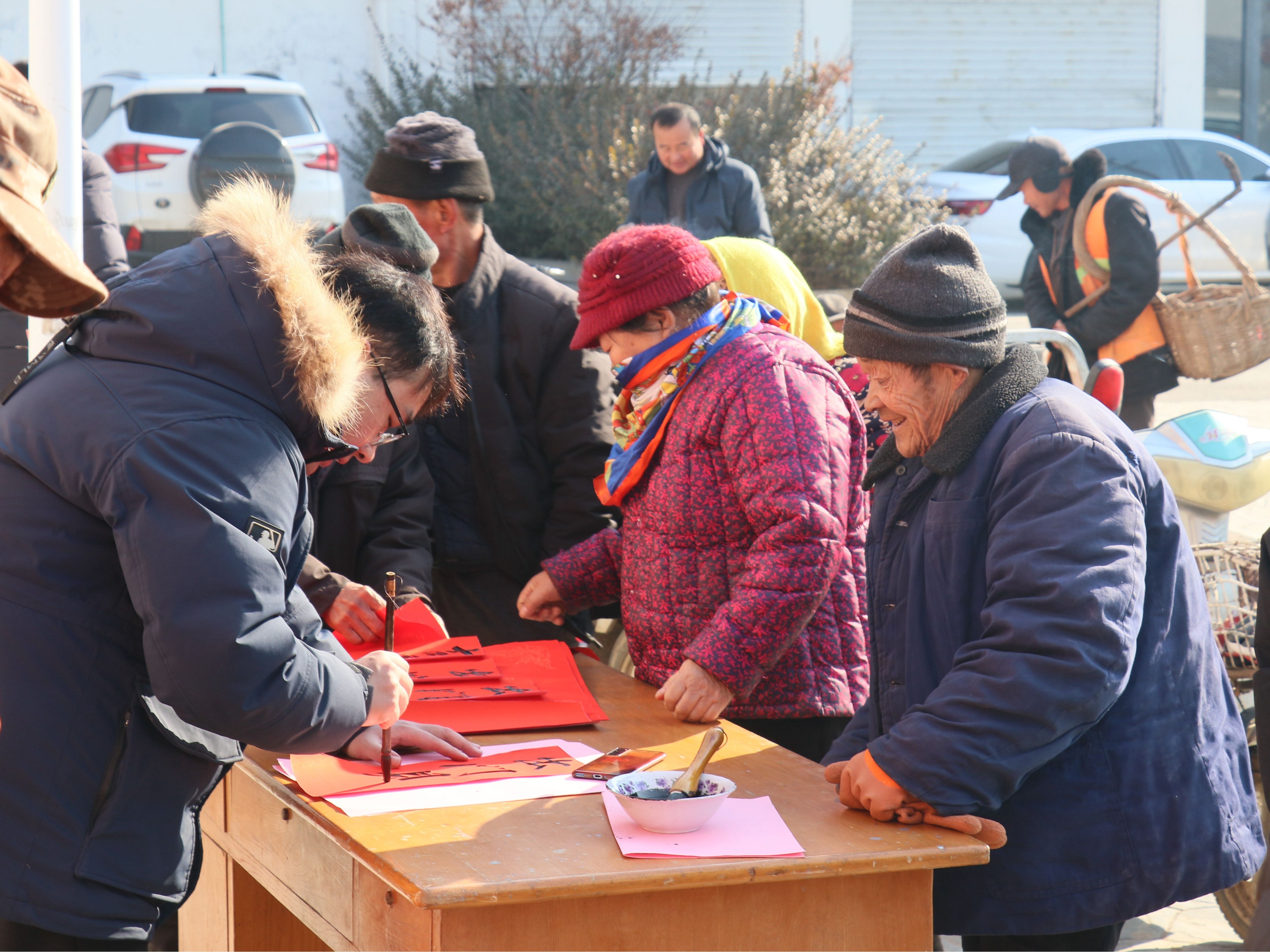 活动现场,喜气洋洋年味十足,书法老师们无惧严寒挥毫泼墨,写对联、写“福”字,笔力雄健,气韵生动,一幅幅红红火火的春联和一张张喜气盈盈的“福”字寄托对村民最深厚的新年祝福。“正想着赶集去买春联,真是没想到能领到书法家写的春联,这种年味才足,太激动”村民们纷纷表示。