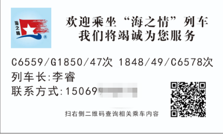 随着春节的日益临近,铁路逐渐迎来了节前出行高峰,旅途中的各种突发情况有所增多。再加上今年铁路部门推出了多项新举措,很多旅客并不熟悉。为了让众多旅客享受到“平安、有序、温馨”的春运旅途,国铁济南局青岛客运段上海动车队的一名列车长李睿,专门设计了便民服务卡,将便民新措施等内容制成二维码,还公开自己的手机号、值乘车次等信息,随时为旅客答疑解惑并提供帮助,受到旅客的一致好评。