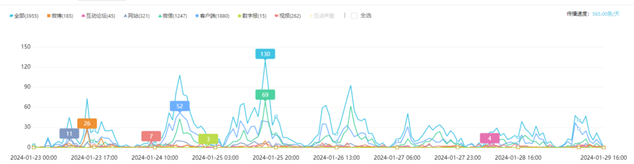 据齐鲁蛙眼舆情舆情大数据平台监测显示,自1月23日至1月29日16时,全网共监测到响水县诈骗案相关信息约3955条。