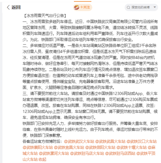 2月4日,“武汉铁路”发布冰冻雨雪天气出行公告:近日,中国铁路武汉局集团有限公司管内沿线所有地区普降冻雨、大雪,导致铁路接触网覆冰导电不良、道岔结冰转换不灵活、线路积雪列车降速运行。列车降速后动车组利用率严重降低,列车往返开行次数大量减少。为此,铁路部门采取停运动车组列车等方式确保旅客出行安全。